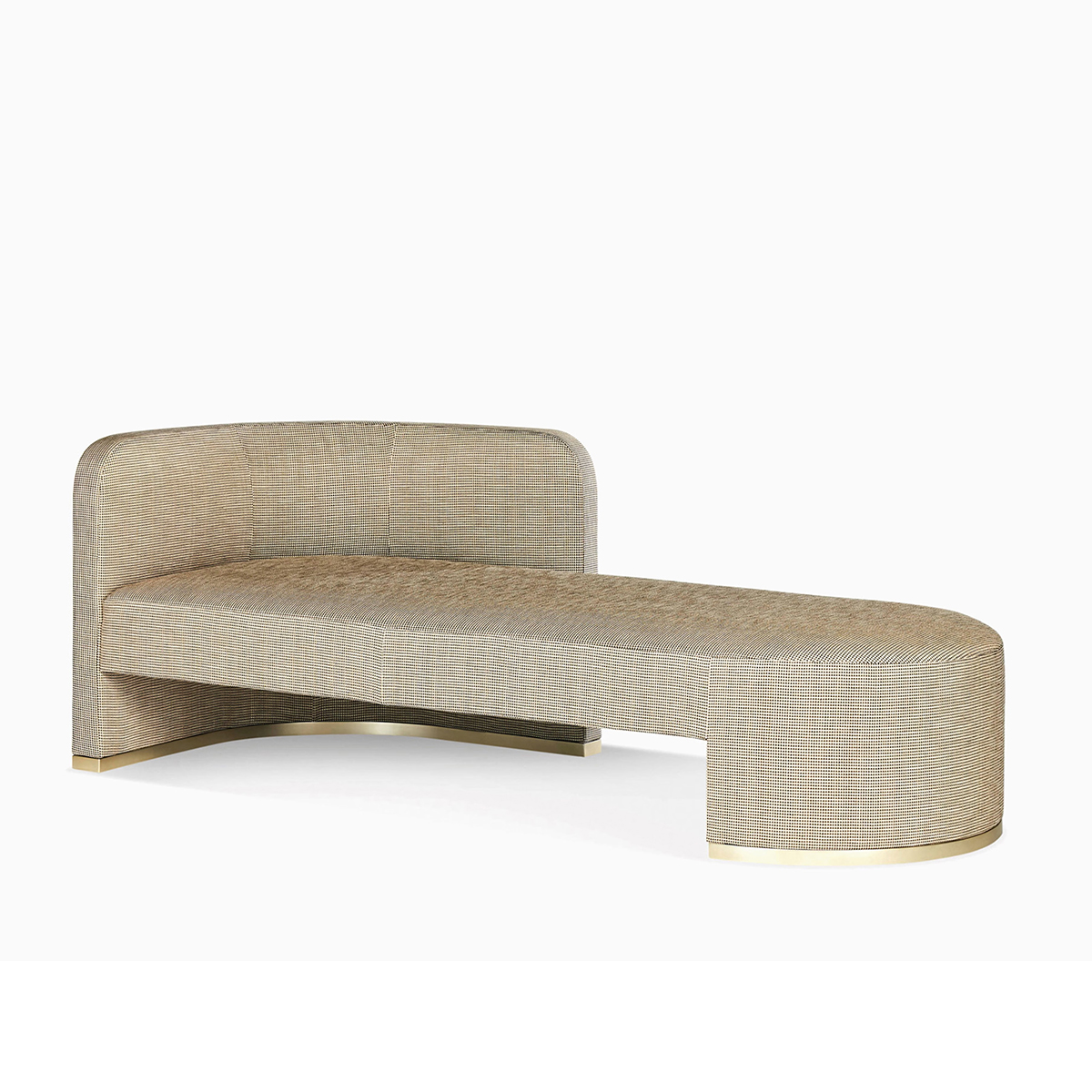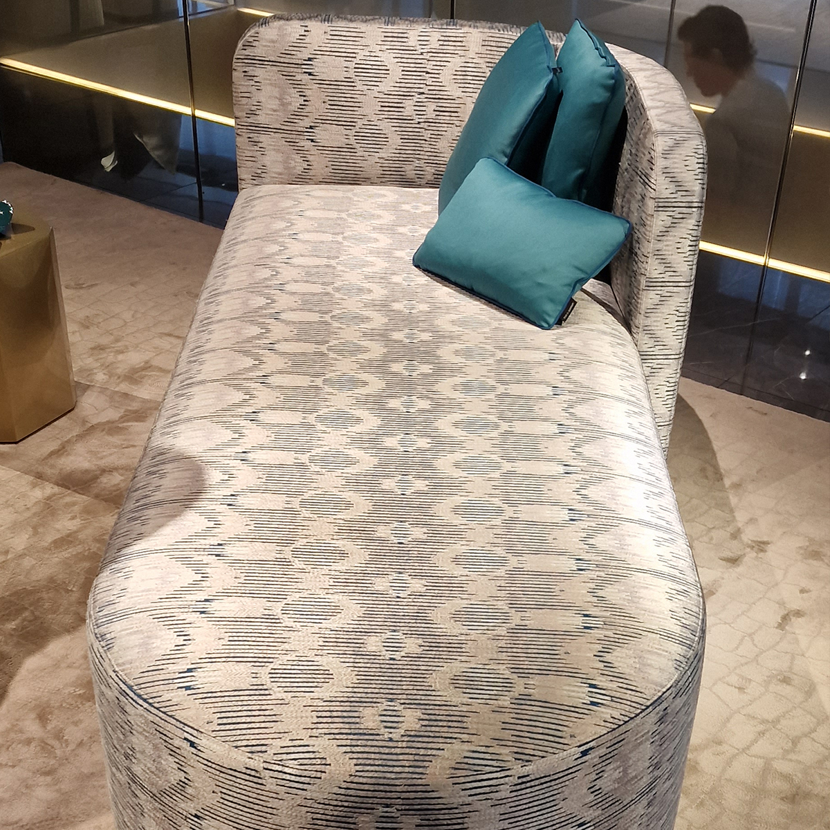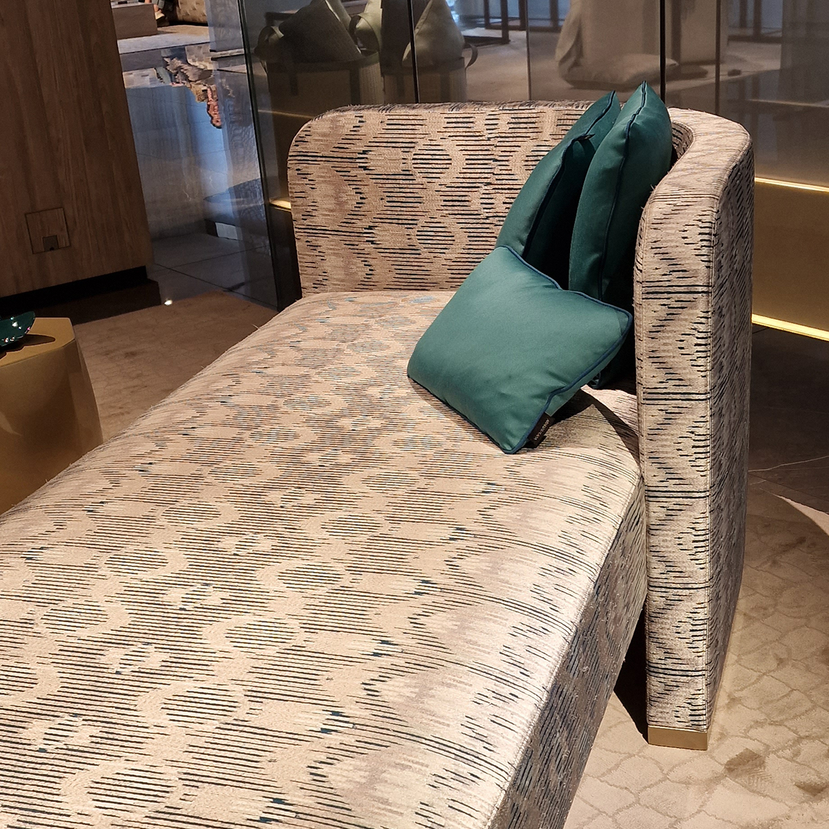 Кушетку Pretty определяет баланс прямых и закругленных линий. Лаконичная и элегантная форма обогащена эффектной мерцающей тканью, характерной для модного дома, и металлическими деталями.
