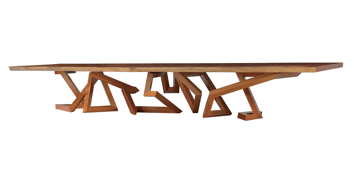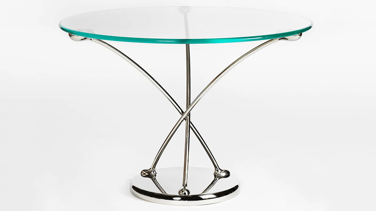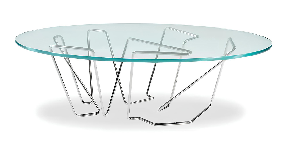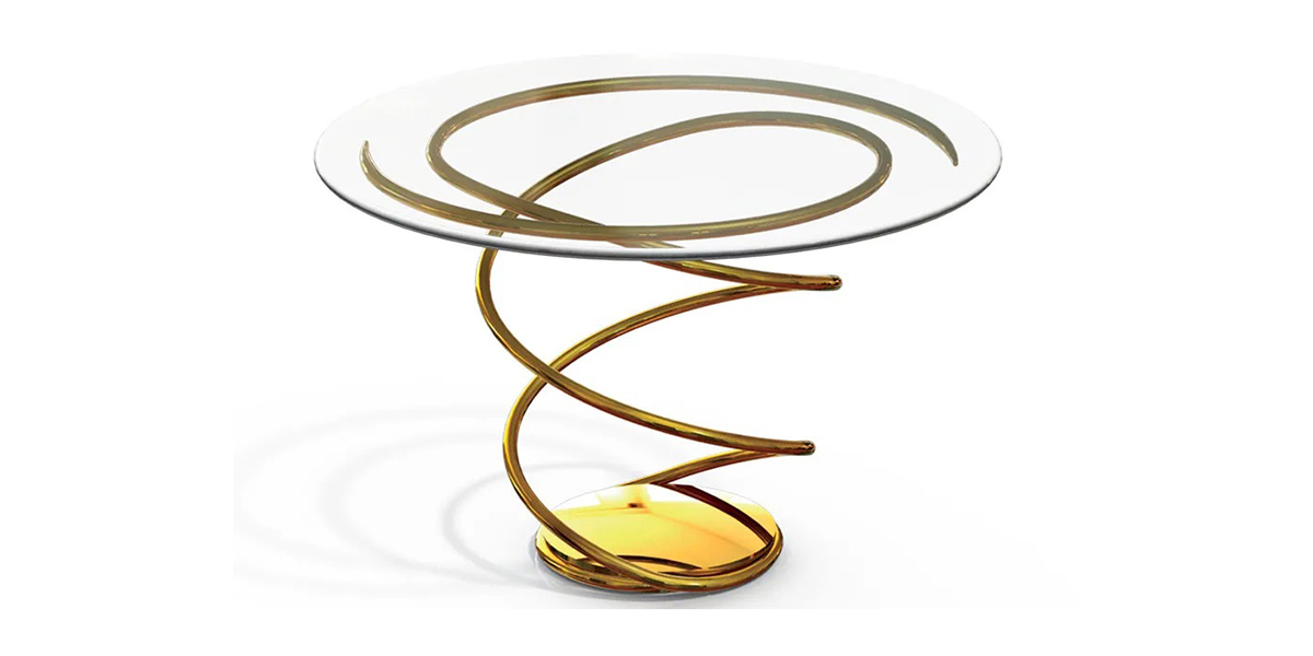 Многие изделия основаны на идее единой линии: ломаной, как в основании обеденного стола, или извилистой, как в случае с спиралевидным металлическим основанием, покрытым 24-каратным золотом, в приставном столике со стеклянной столешницей.