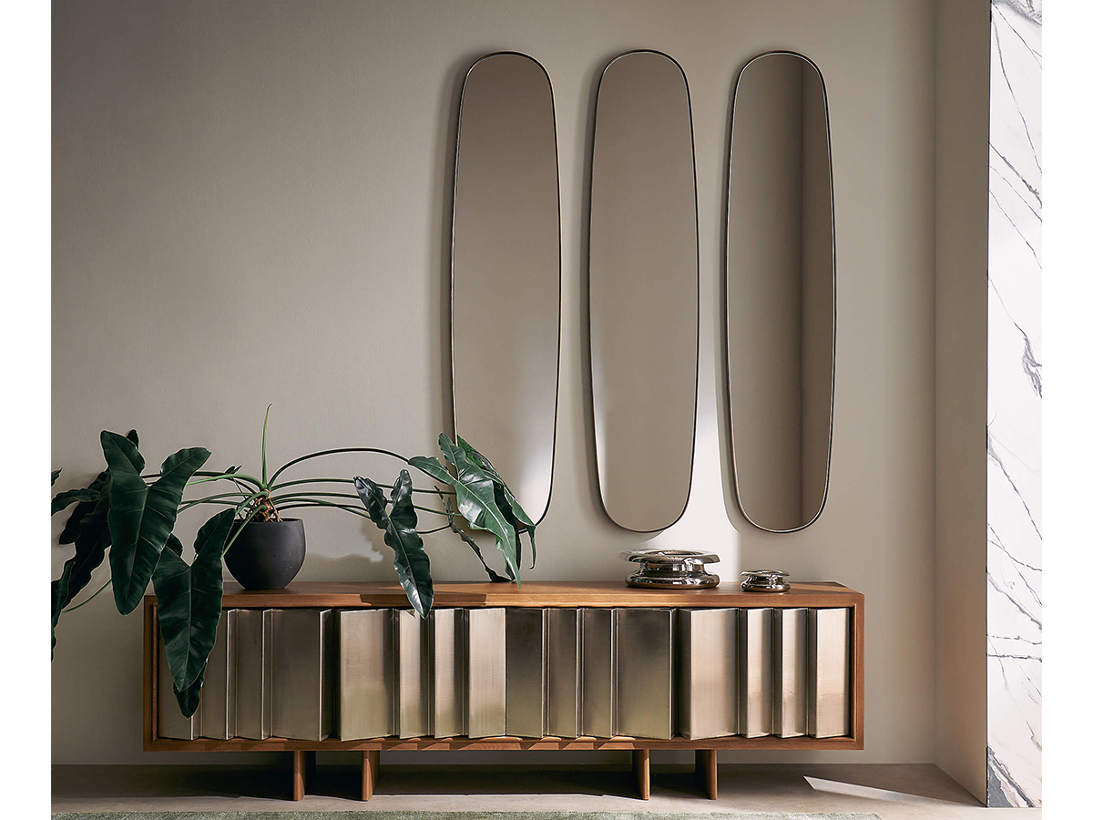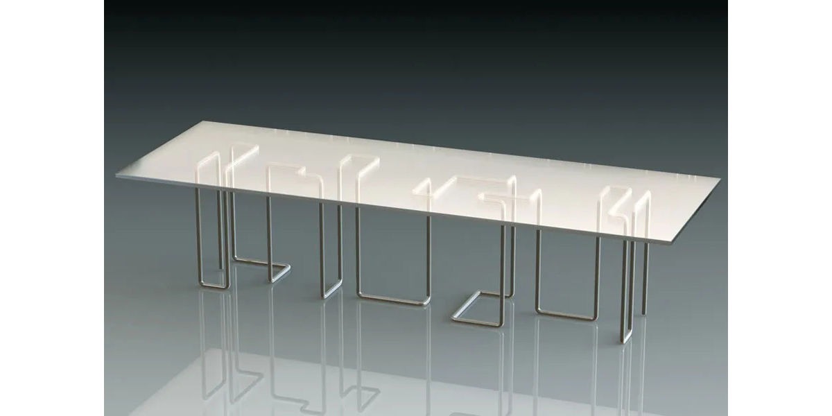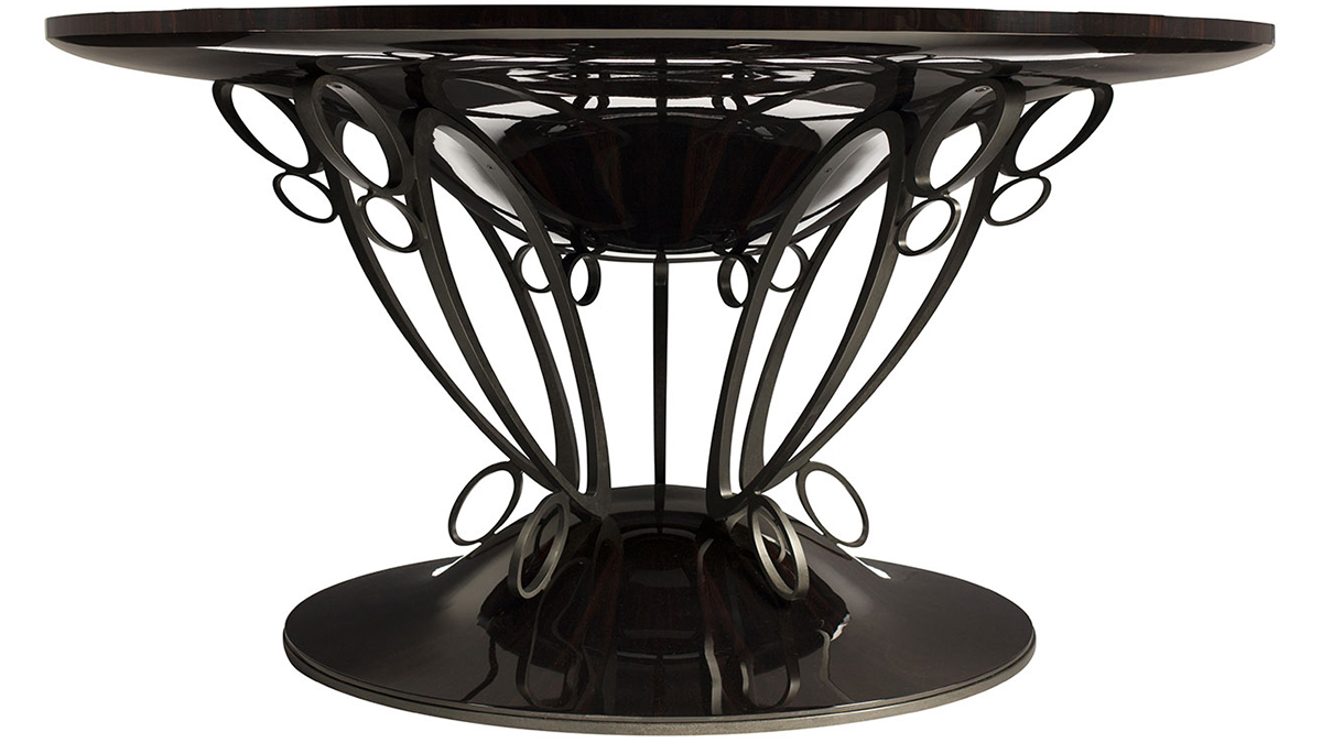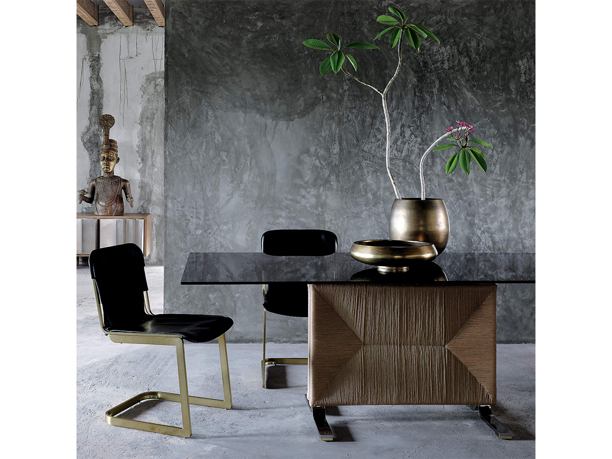 Многие изделия основаны на идее единой линии: ломаной, как в основании обеденного стола, или извилистой, как в случае с спиралевидным металлическим основанием, покрытым 24-каратным золотом, в приставном столике со стеклянной столешницей.