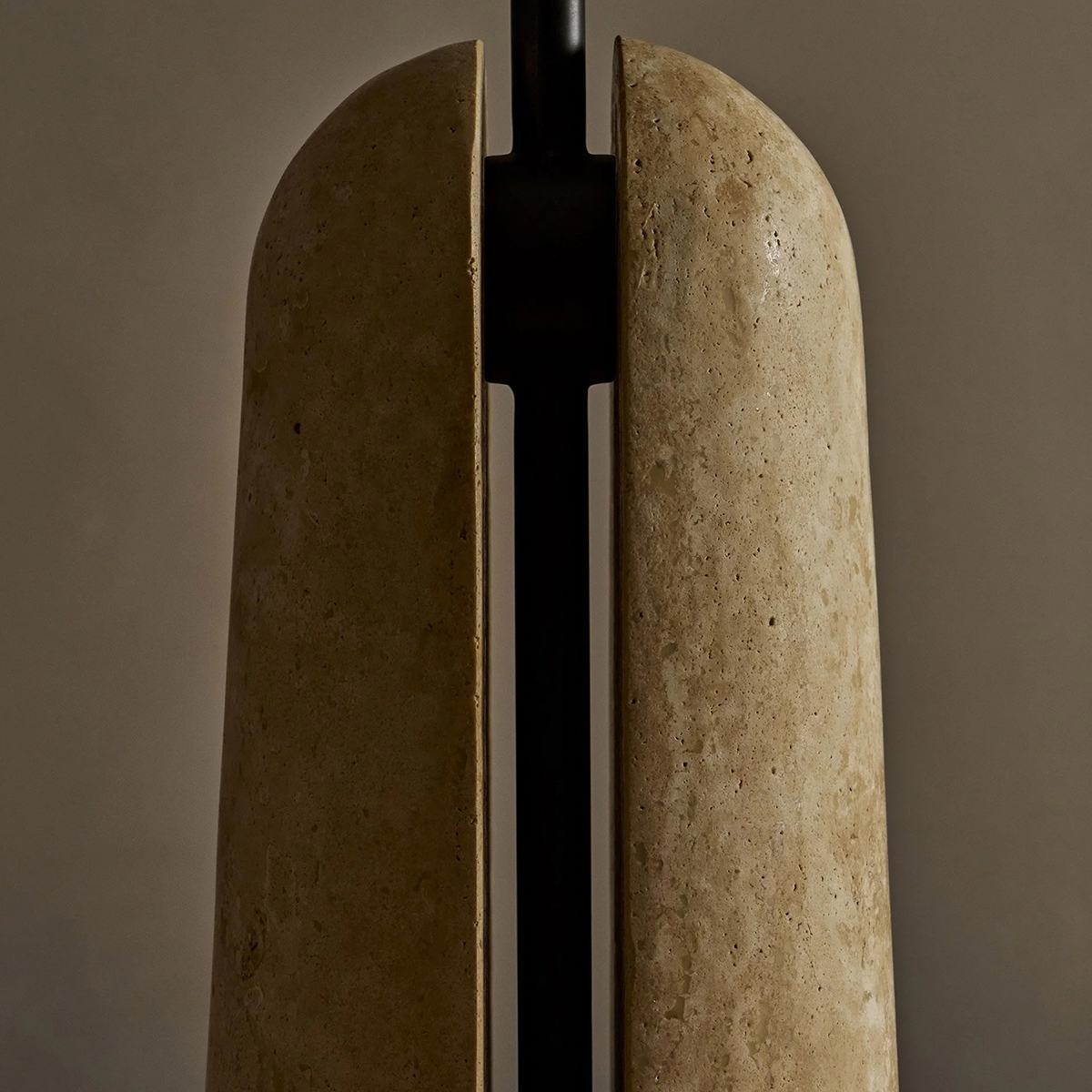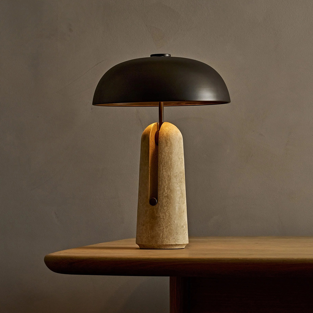 Массивная латунная опора покоится на каменном основании, связывая основание с латунным абажуром.