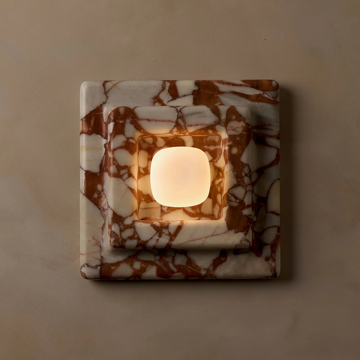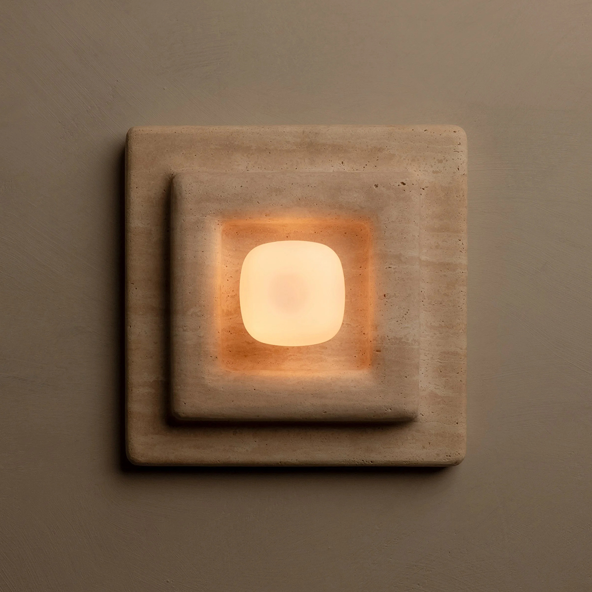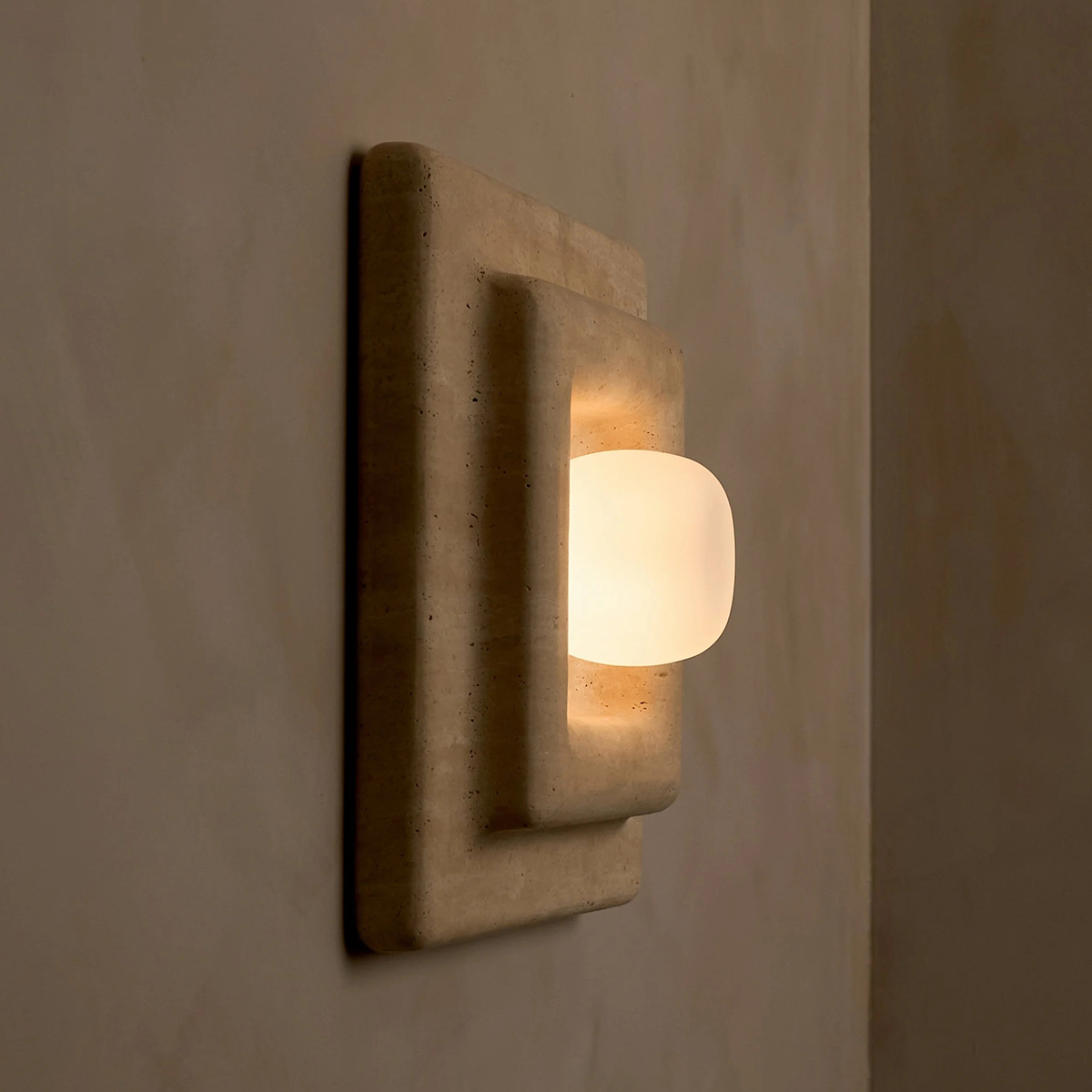 Форма светильника Franklin определяется концентрическими квадратами, которые еще больше подчеркиваются отбрасываемыми ими тенями. Высеченный из цельного каменного блока, светильник с плавными краями выглядит мягко. В центре бра находится диммер из литого стекла, отражающий форму камня — квадратный, но с округлыми деталями.