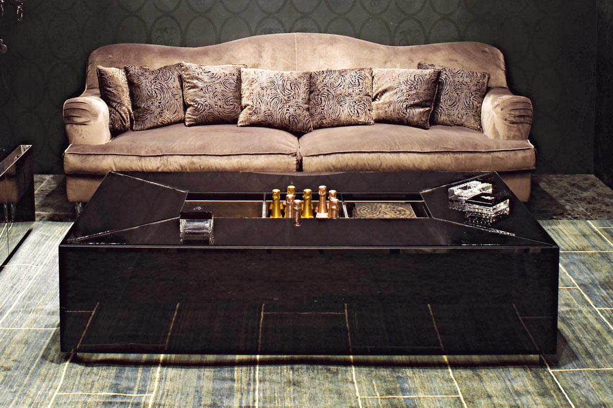 Если душа просит оригинальности, на помощь приходят итальянские мастера. В новой коллекции Visionnaire by Ipe Cavalli представлен интересный журнальный столик Pelleas. Он покрыт темным глянцевым стеклом, что само по себе обычно, зато нарядно. Однако в центральной части сделан специальный отсек для бутылок. Такое решение понравится ценителям хороших напитков и удобных диванов.