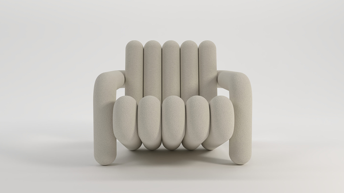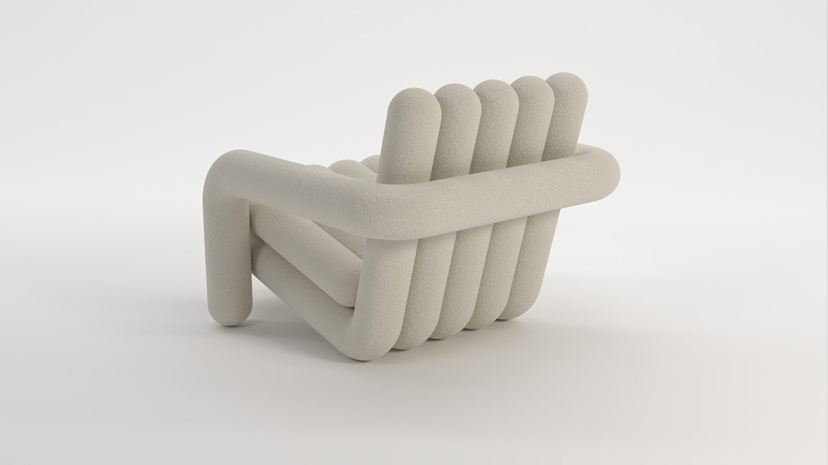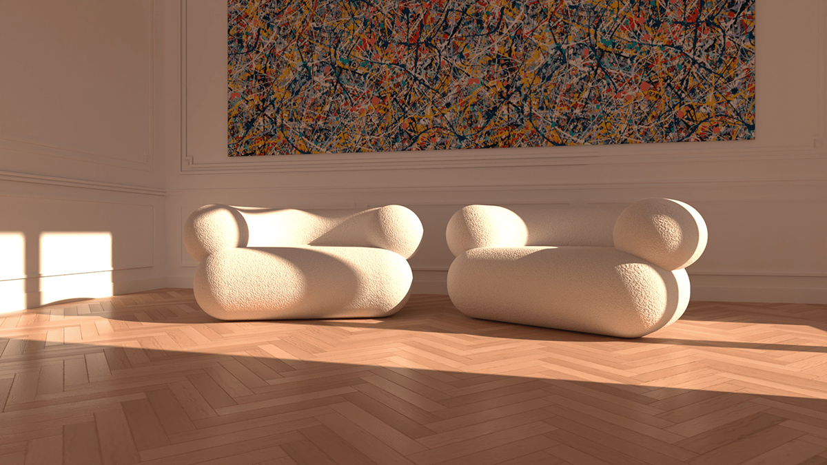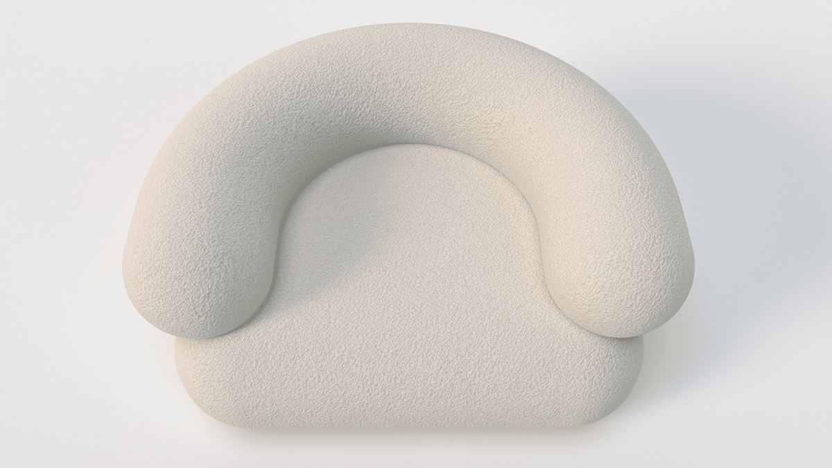 Биоморфное и немного неотеническое кресло полностью выполнено вручную мастерами Ateliers Jouffre. Фактически оно состоит из двух объемов: более крупного сиденья и низкого — спинки, переходящей в подлокотники.