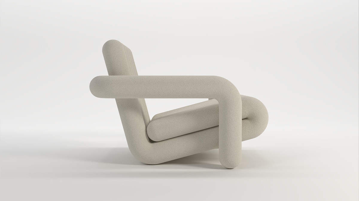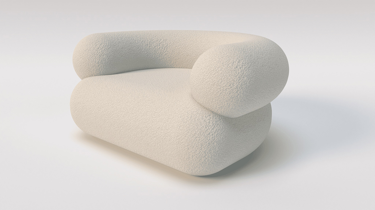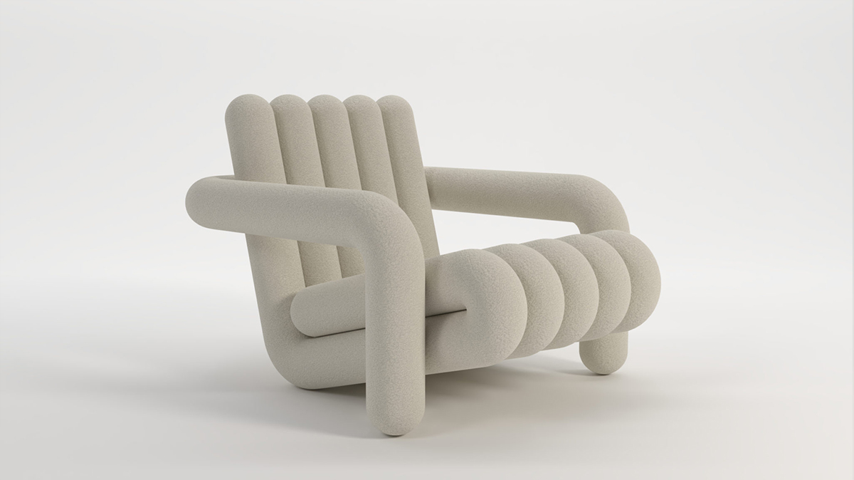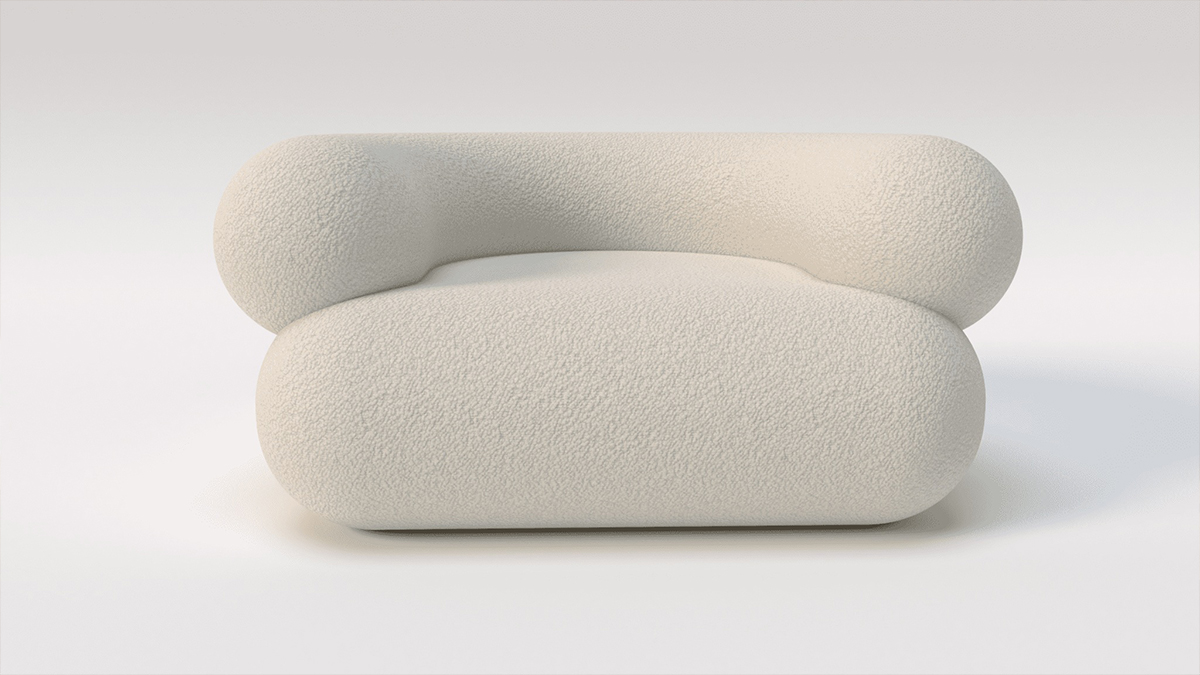 Биоморфное и немного неотеническое кресло полностью выполнено вручную мастерами Ateliers Jouffre. Фактически оно состоит из двух объемов: более крупного сиденья и низкого — спинки, переходящей в подлокотники.