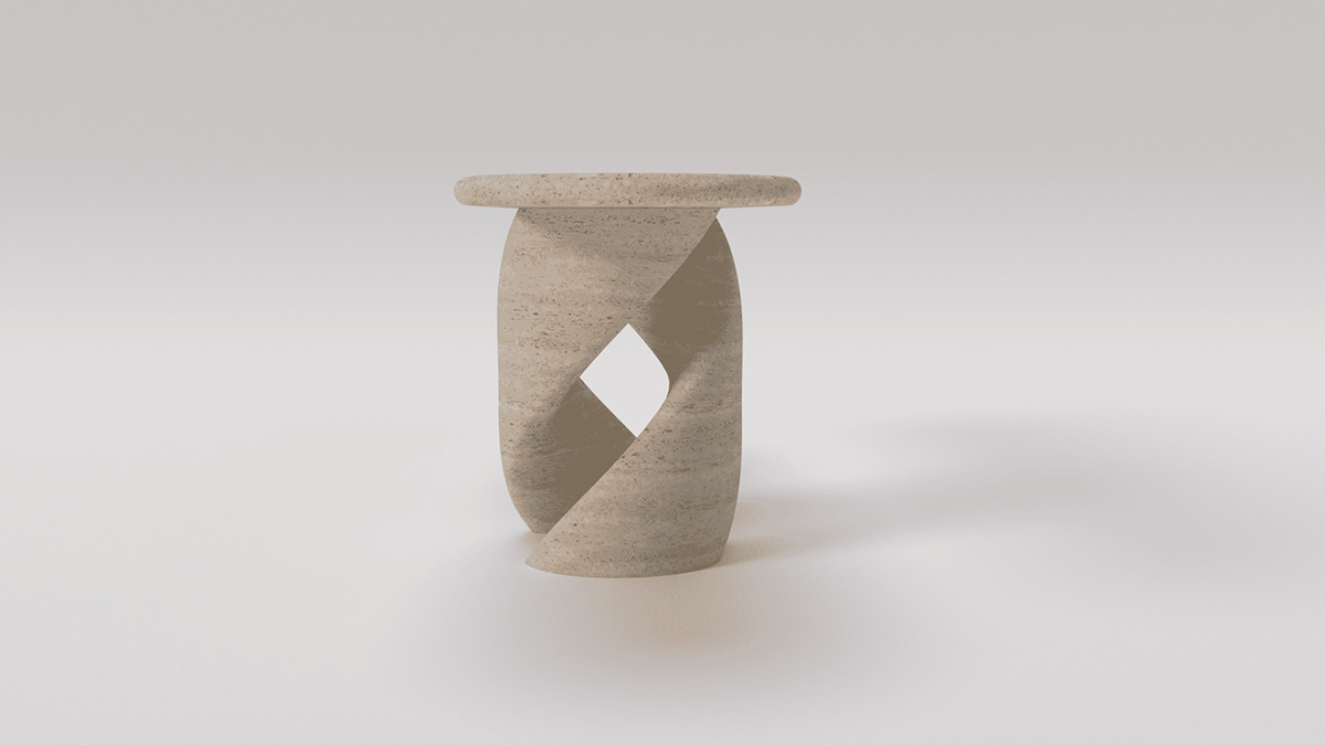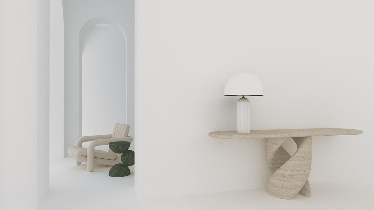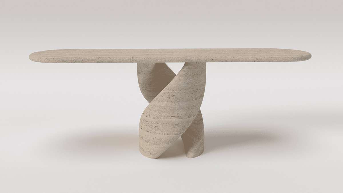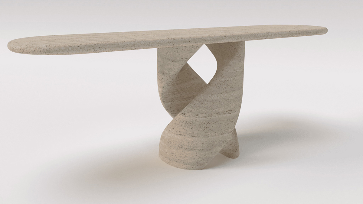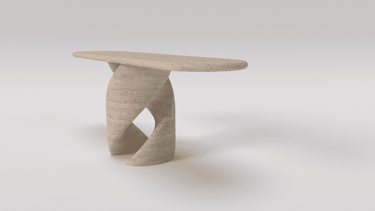Консоль полностью изготовлена из римского травертина в Ateliers Saint-Jacques. Ее отличают скругленные формы и переплетающиеся, словно две фигуры в танце, ножки.