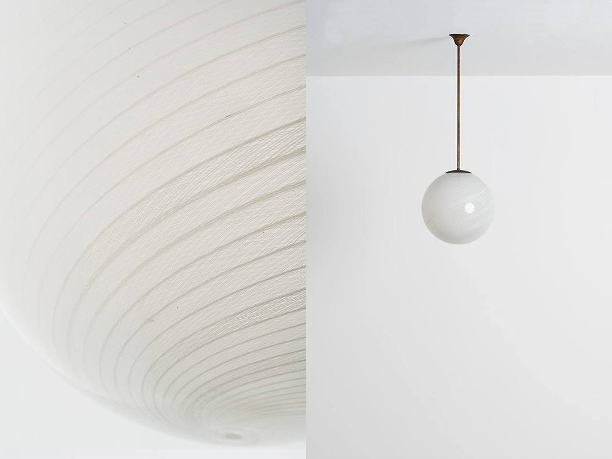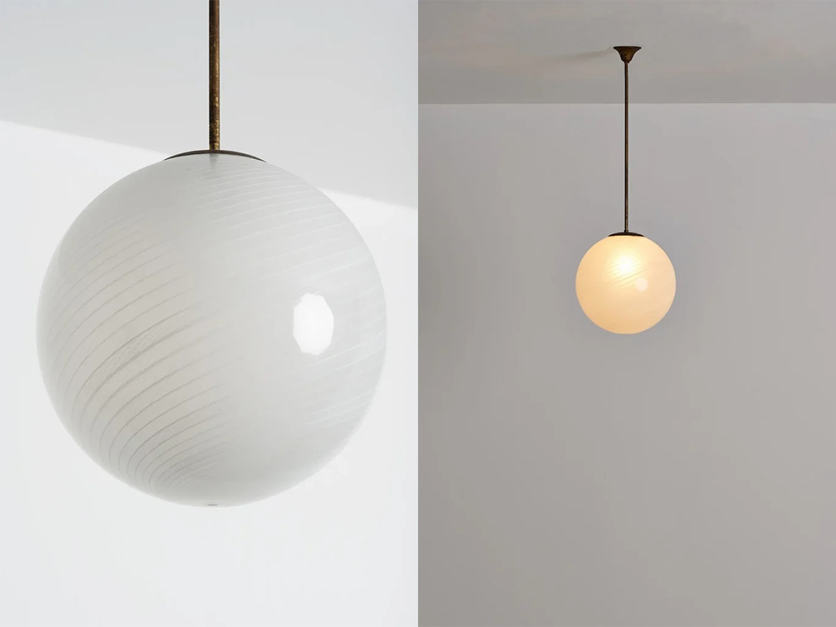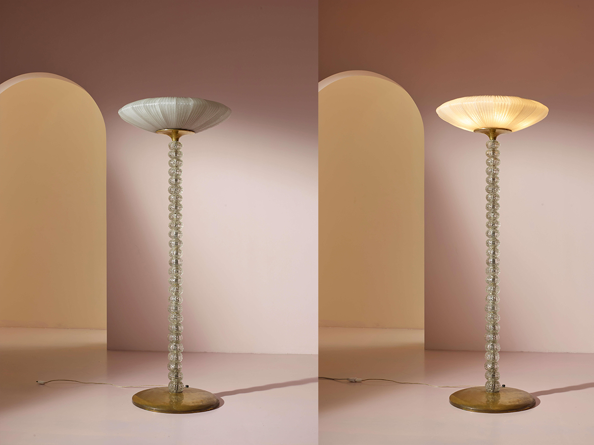Этот светильник воплощает поэтическую строгость, характерную для раннего сотрудничества Скарпы и Venini: вертикальная композиция необычайной ясности, где материал и свет сосуществуют в идеальном равновесии. Высокий стержень образован чередой выдувных стеклянных сфер ручной работы, каждая из которых тщательно обработана в технике bugnato, то есть имеет текстуру с граненой поверхностью, преломляющей свет в нескольких направлениях. Этот ритм прозрачных объемов завершается большим ребристым стеклянным рассеивателем, изящно изогнутым, словно открытая раковина, который испускает вверх теплое рассеянное сияние. Конструкция опирается на круглое латунное основание, патина которого подчеркивает контраст между металлом и стеклом, одновременно приземляя воздушность лампы.