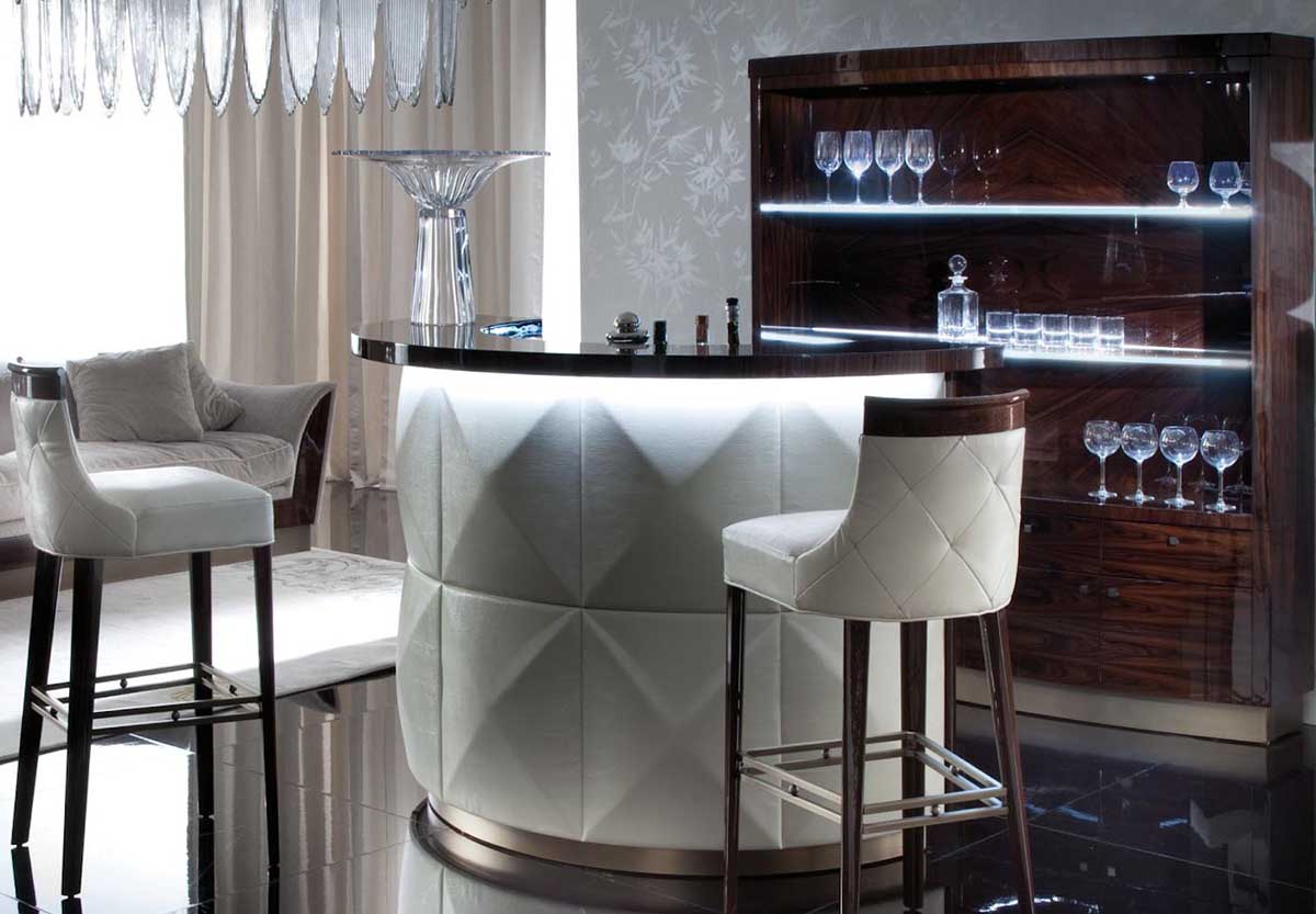 Полукруглая барная стойка Coliseum также отличается небольшими габаритами. Передняя часть бара может быть обита натуральной кожей, нубуком, замшей или бархатом на ваш выбор. Кроме барных полок и столешницы в этой модели есть встроенный холодильник на 60 литров.