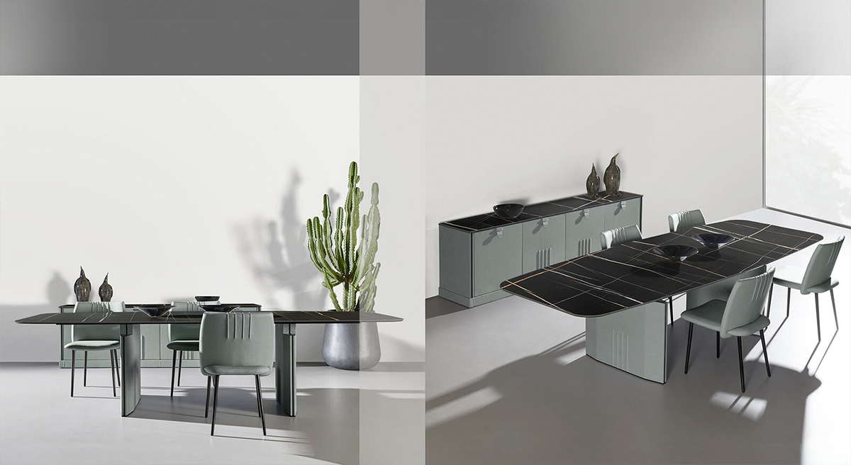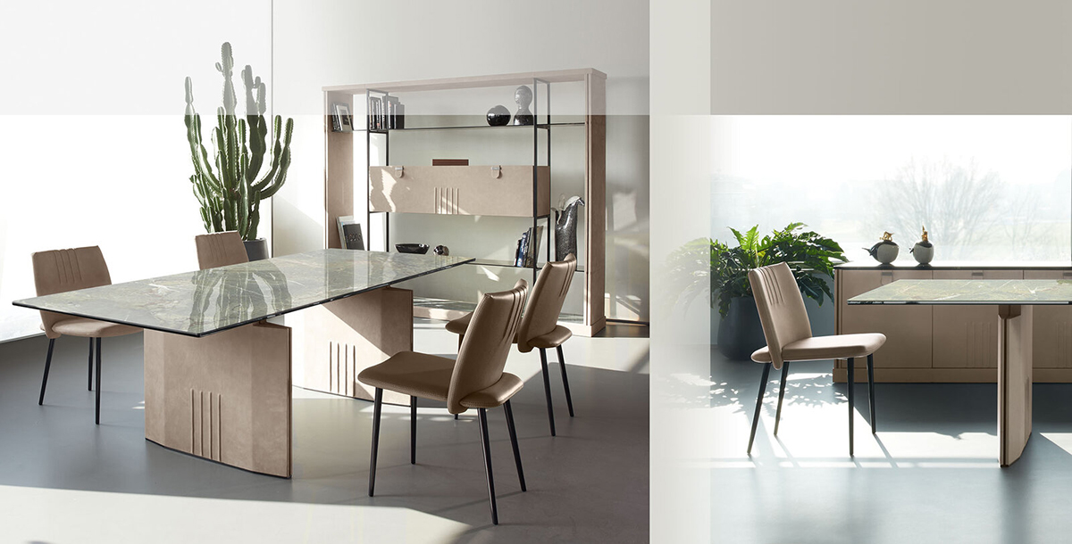 Обеденная группа Philly выглядит более геометрично и монументально, но в то же время уютно. Тонкая мраморная столешница покоится на двух перпендикулярных объемах, полностью обтянутых натуральной кожей.Прямоугольный обеденный стол PHILLY, Стул PHILLY