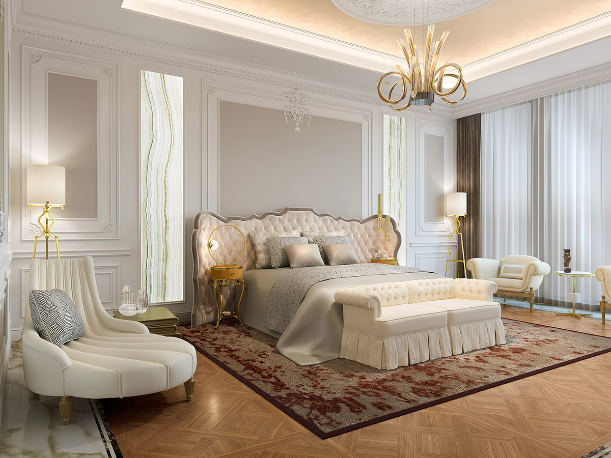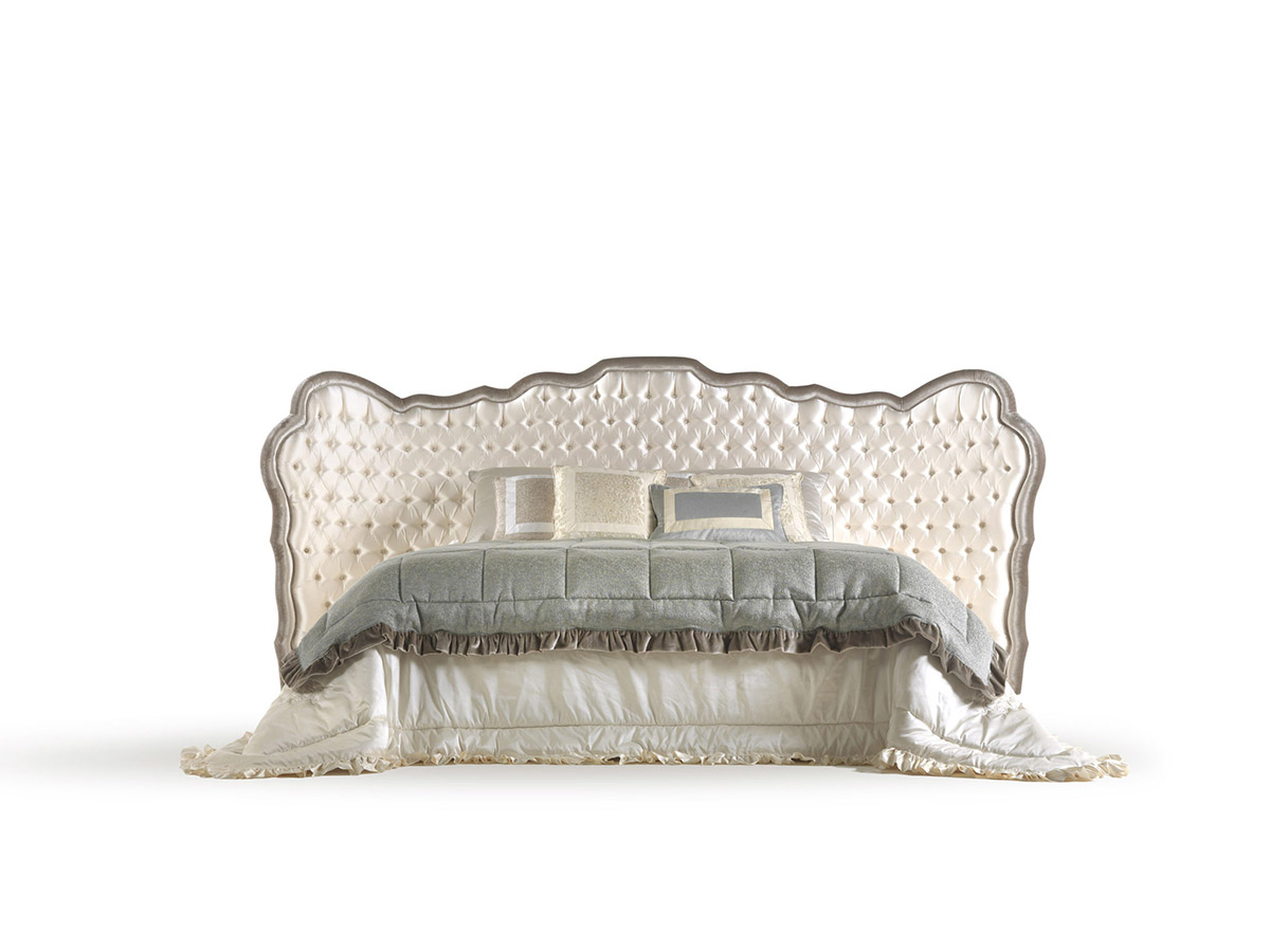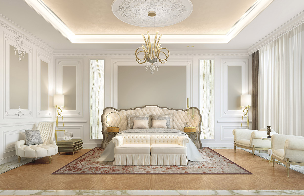 Перед экранами стоят изящные ночные столики с витиеватыми основаниями Torchon, В изножье кровати – оригинальная, словно раздвоенная, банкетка Musa.