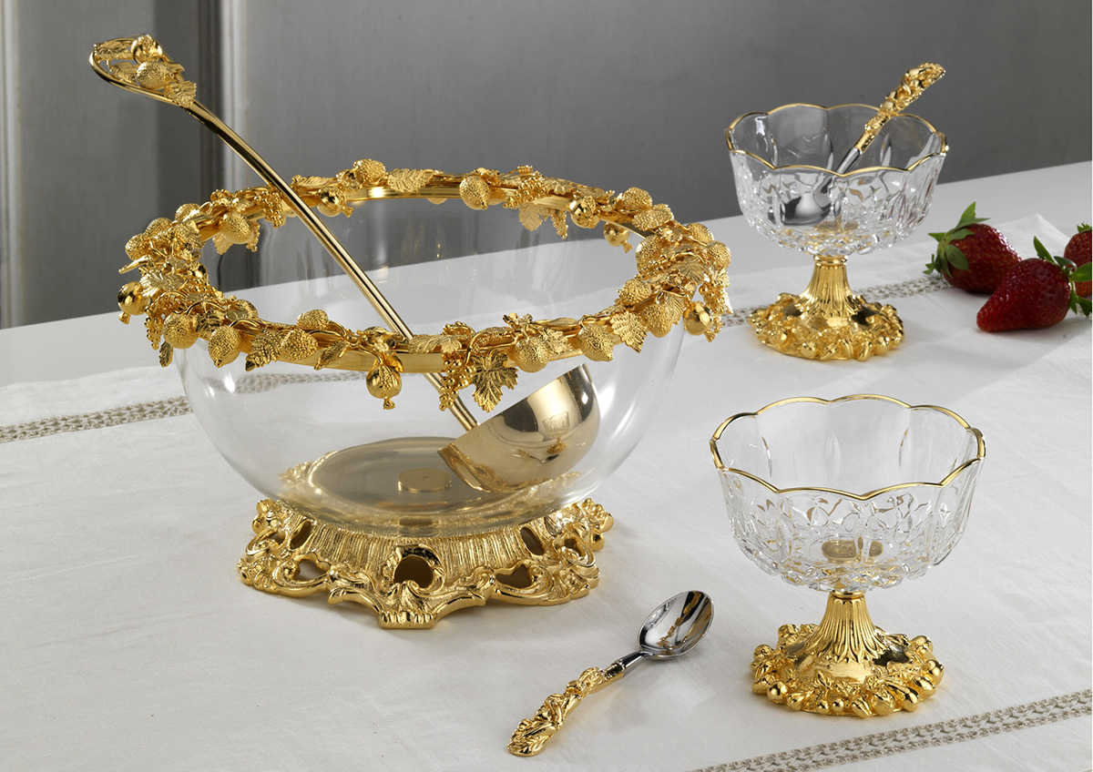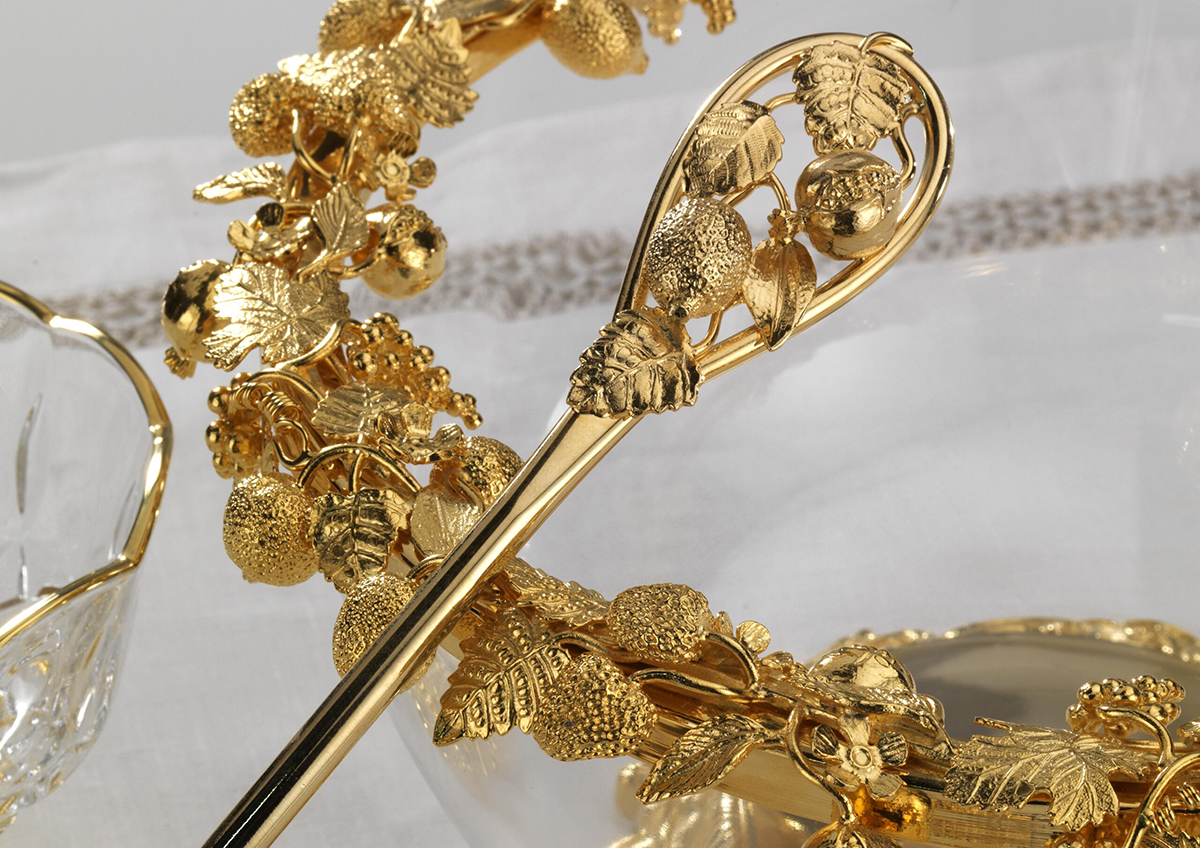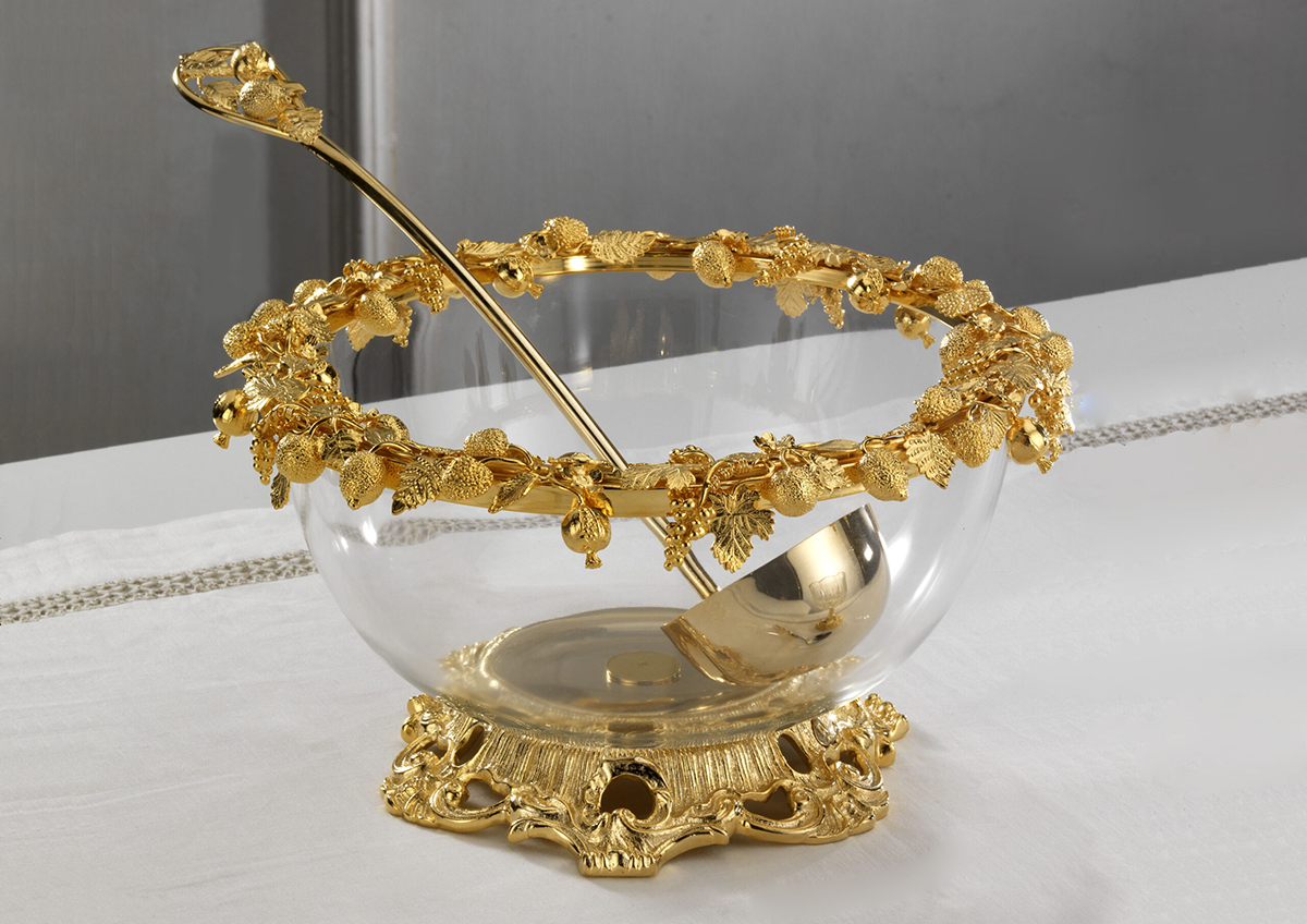 Чаша для фруктов выглядит одновременно нежно и торжественно: кромку глубокой чаши оплетает композиция из тончайших листьев и ягод, где видна каждая, даже самая мельчайшая, деталь. Каждый элемент кромки и основания вырезается и полируется вручную, а затем покрывается 24-каратным золотом. Сама чаша изготовлена из 24% свинцового хрусталя. В комплекте – ковш с украшенной ручкой на случай, если вы пожелаете подать фрукты или ягоды гостям порционно.