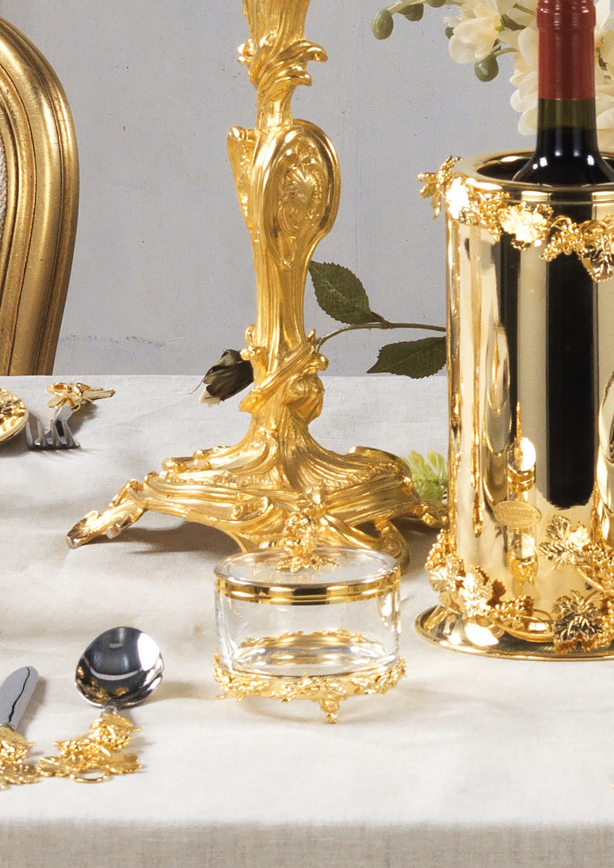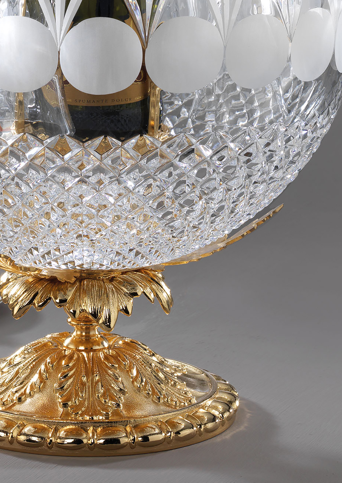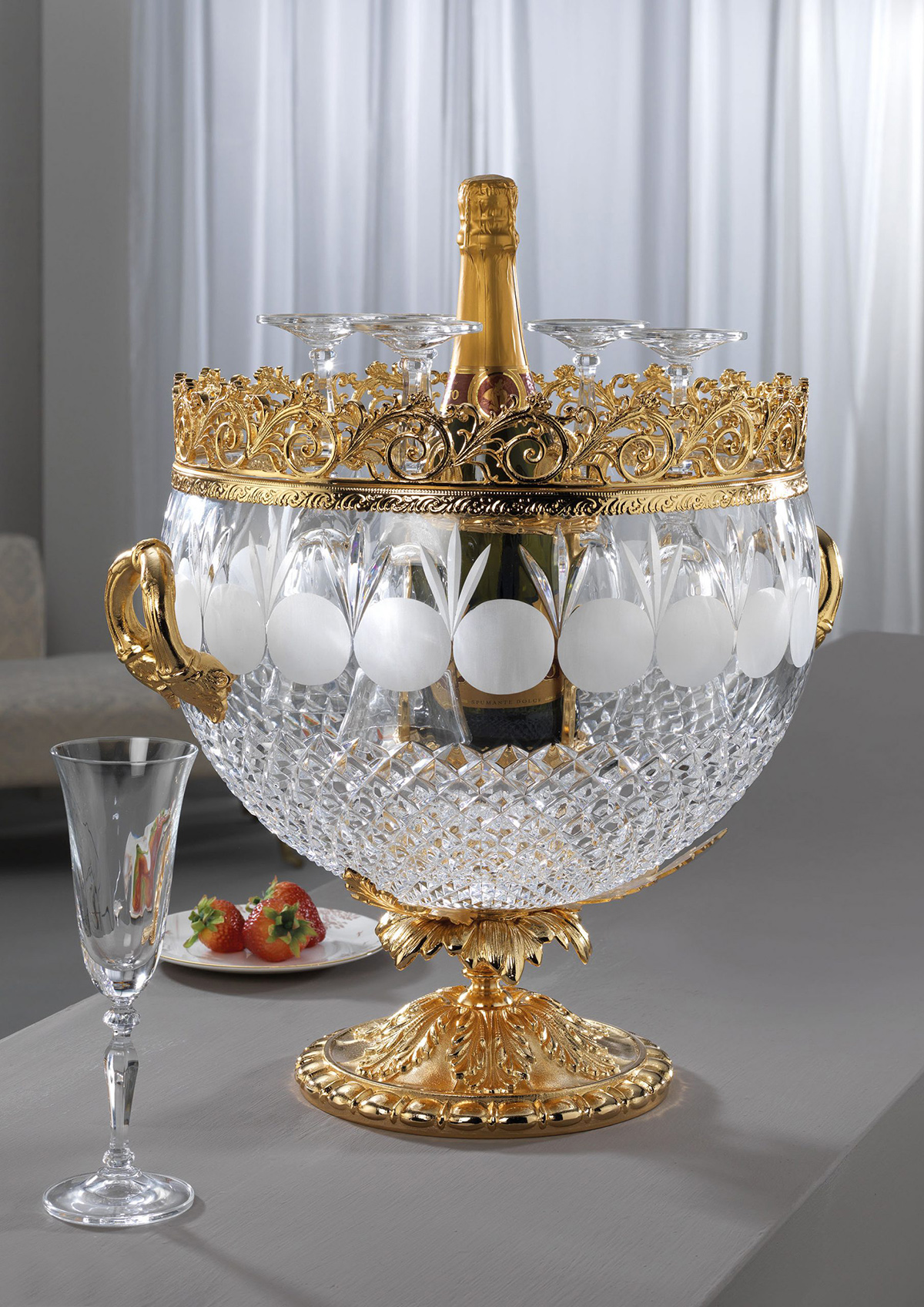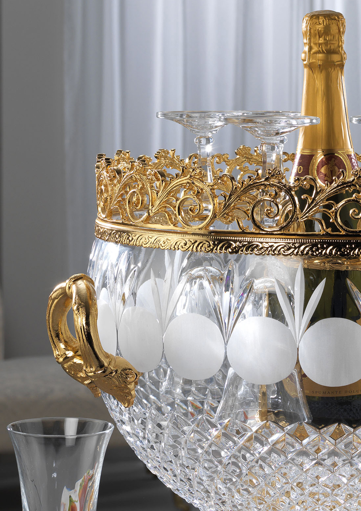 Изящное ведерко для шампанского и бокалов представлено в виде глубокой чаши из выдувного и выгравированного вручную свинцового хрусталя с ажурной высокой каймой, ручками и основанием из бронзы в отделке 24-каратным золотом. Полностью ручная работа.