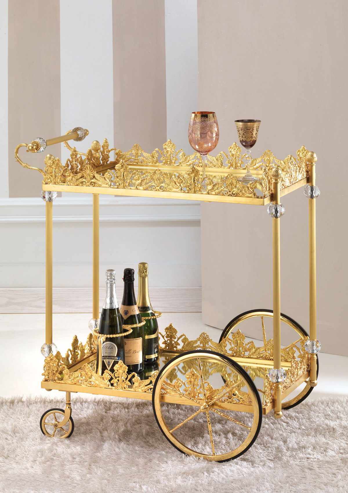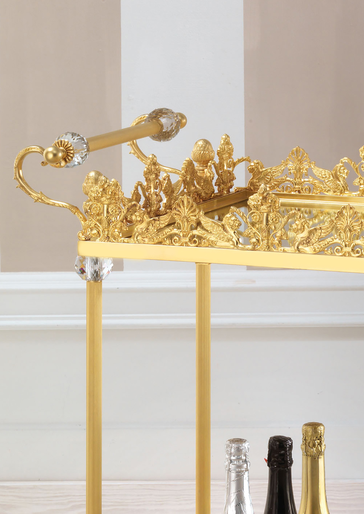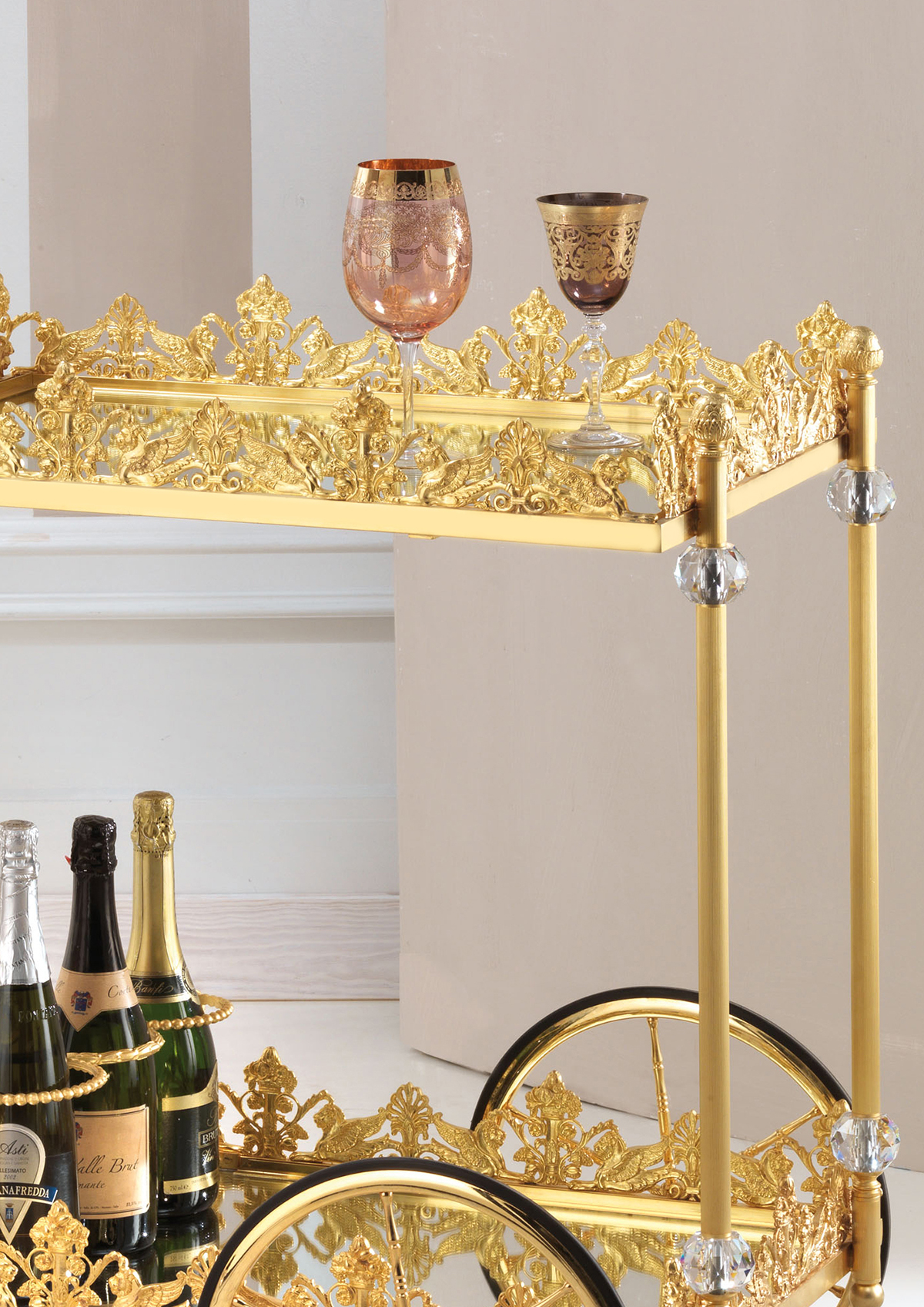 Сервировочная тележка необязательно должна быть строго утилитарным предметом, который хочется как можно скорее скрыть из виду. Сервировочная тележка L’Originale – произведение искусства: глянцевые колесики, ажурное кружево украшений из бронзы в отделке полированным 24-каратным золотом, изящная ручка и тонкие основания, увенчанные хрустальными сферами.