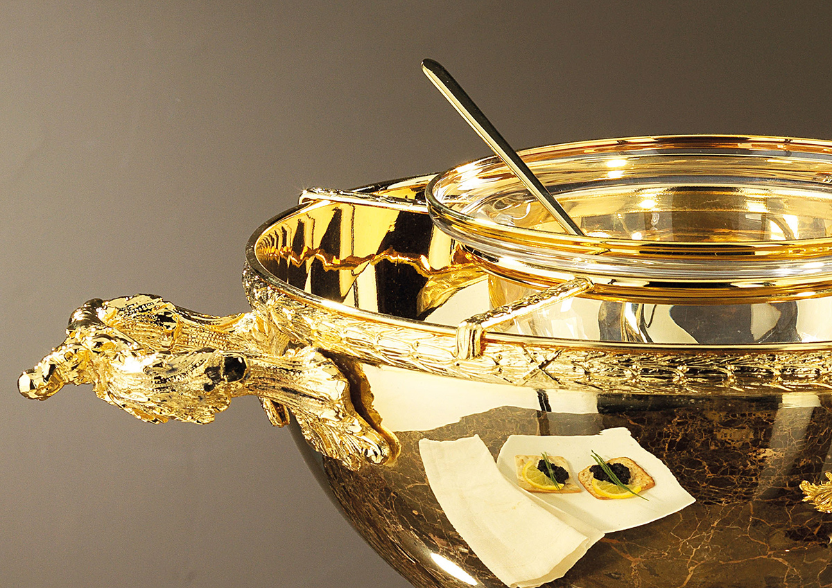 Чаша для икры из свинцового хрусталя с ложечкой покоится внутри большой чаши, созданной из отполированной вручную до зеркального блеска бронзы. Фигурные ручки, кайма и основание в виде трех рыб выполнены из бронзы в отделке полированным 24-каратным золотом.