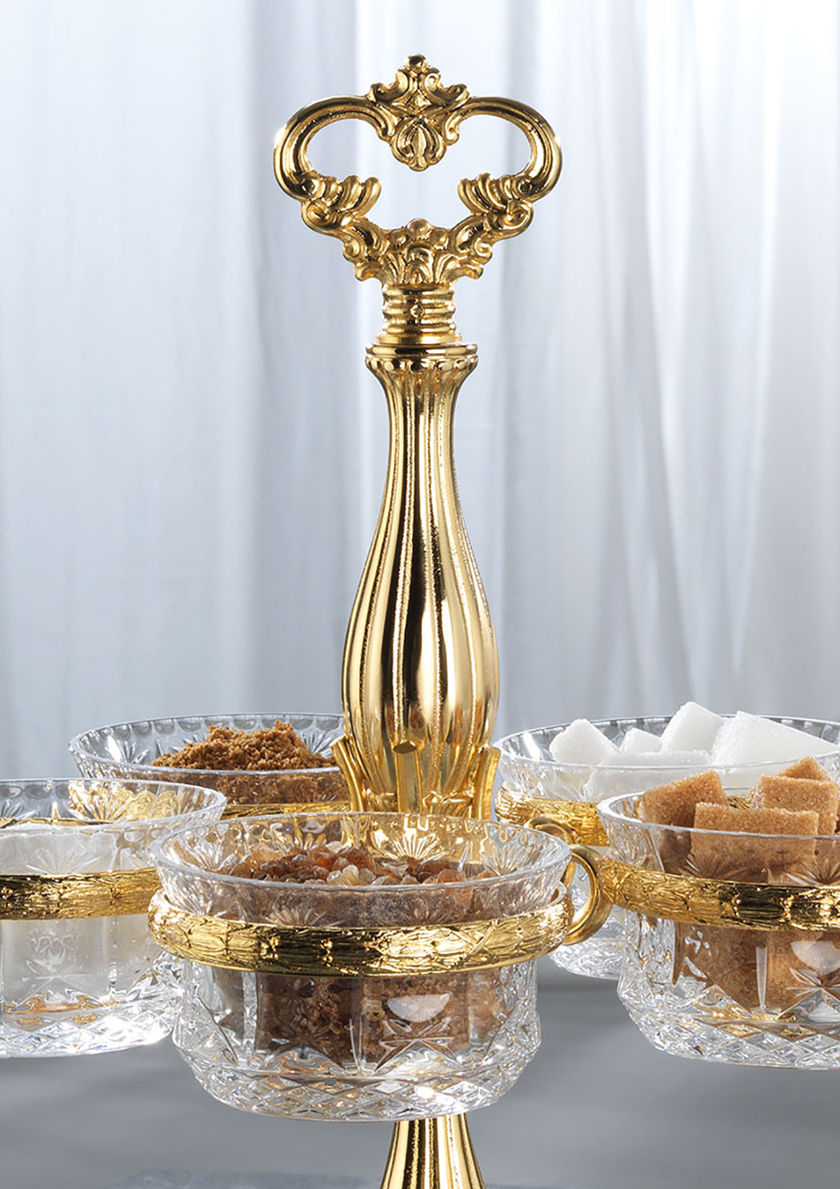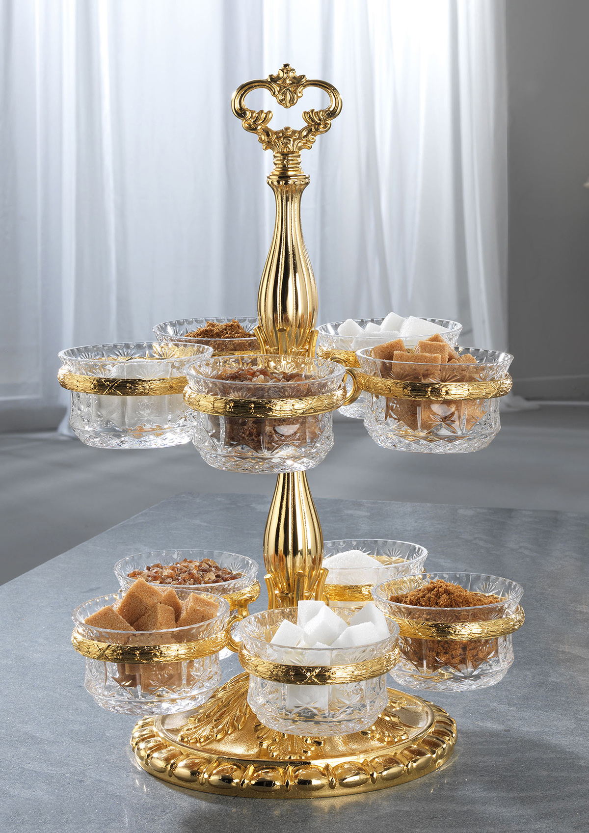 Необычная сахарница выполнена в виде горки с 10 хрустальными чашками, в которых необязательно хранить сахар разного вида, – их можно приспособить для более полезных сладостей, сухофруктов или орехов. Центральный фигурный стержень выполнен из бронзы в отделке 24-каратным золотом. Изысканный способ подать на стол любимые лакомства.