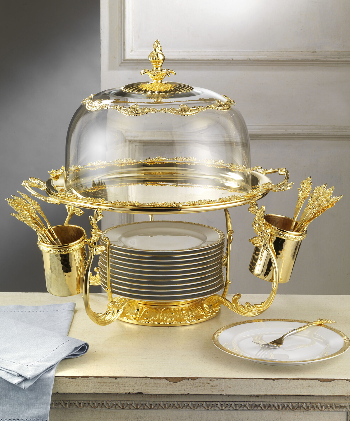 Подставка для тортов еще никогда не была такой удобной: помимо подставки для торта с куполом, изделие включает подставку для блюд и чаши для десертных приборов. Купол выполнен из прозрачного свинцового хрусталя. Подставка, чаши и декор – из бронзы в отделке полированным 24-каратным золотом.