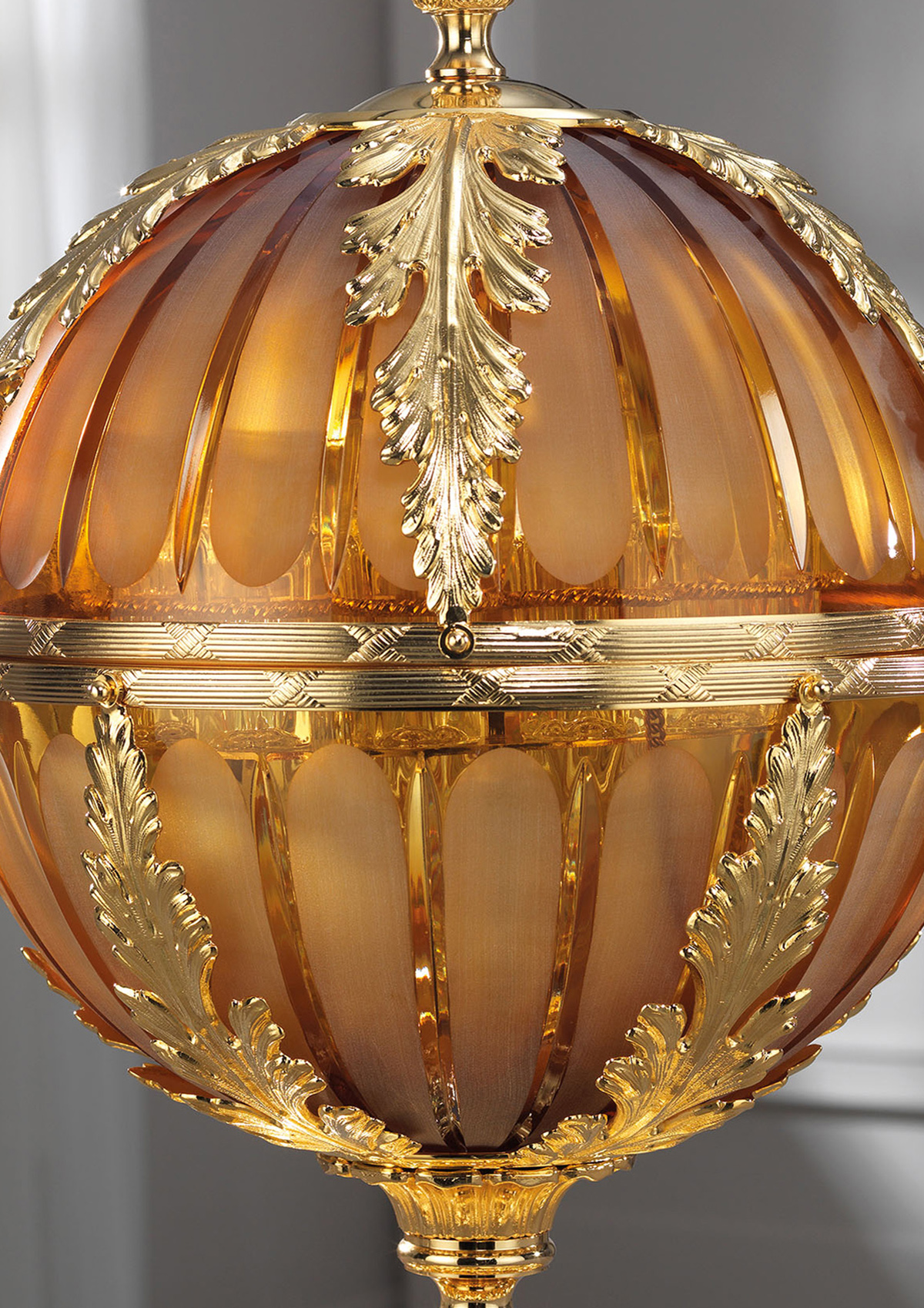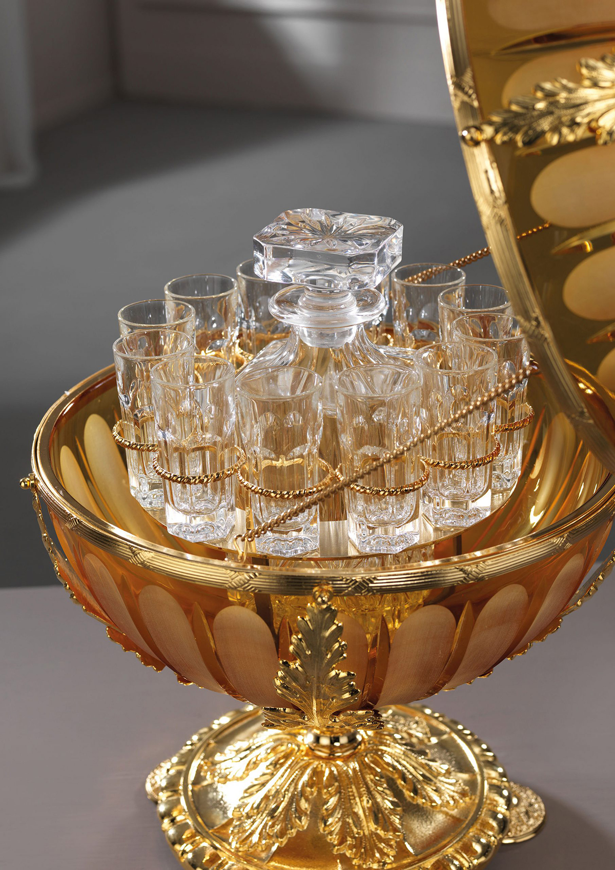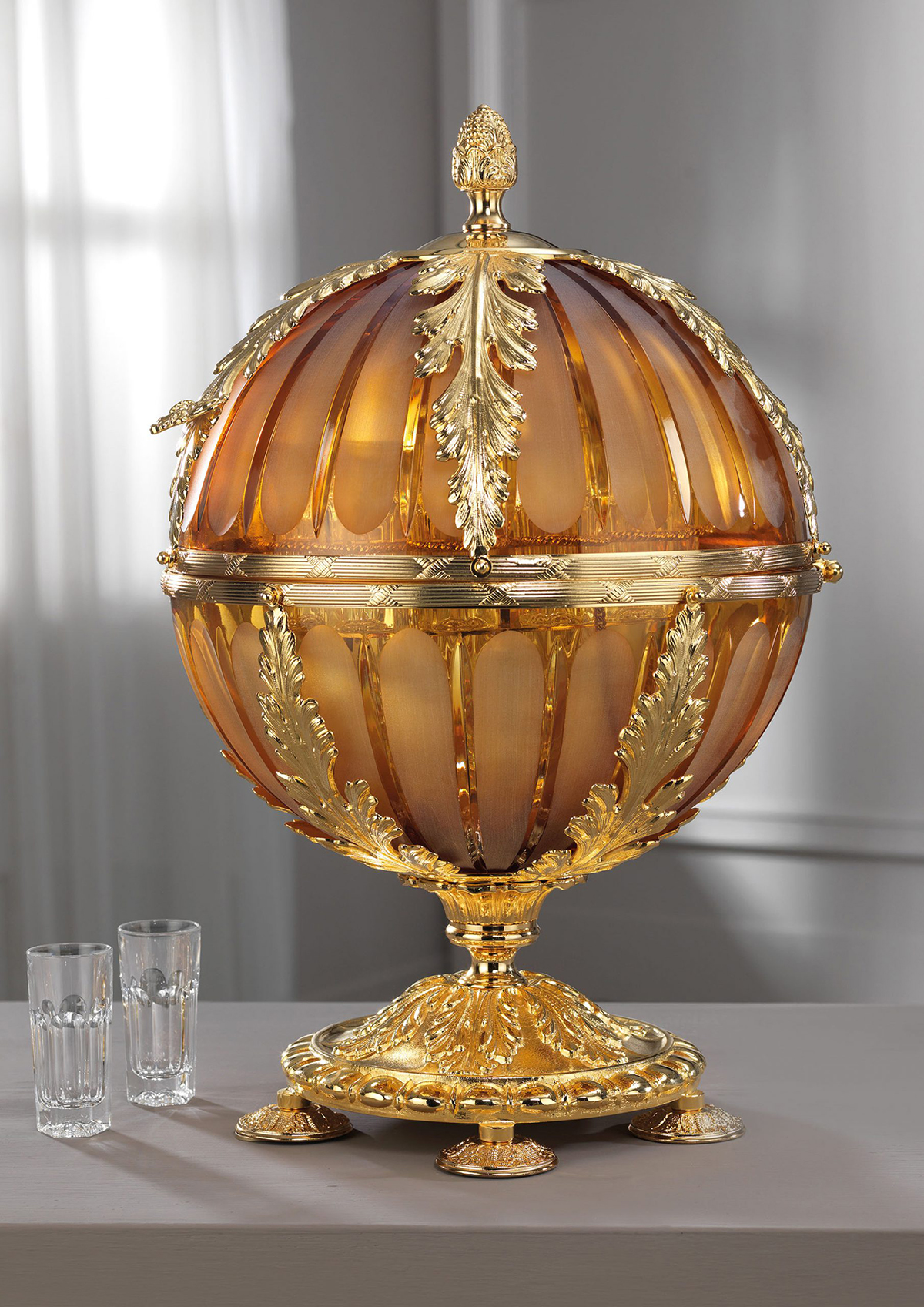 Подставка для алкогольных напитков в виде идеальной сферы из янтарного хрусталя, матового и прозрачного, с декором из бронзы в отделке 24-каратным золотом. Красиво сформированные листья, вырезанные и отполированные вручную, подчеркивают теплый янтарный оттенок хрусталя. Венчает подставку ручка в виде бутона. Согласитесь, такая подставка – эффектный способ подачи коллекционного алкоголя.