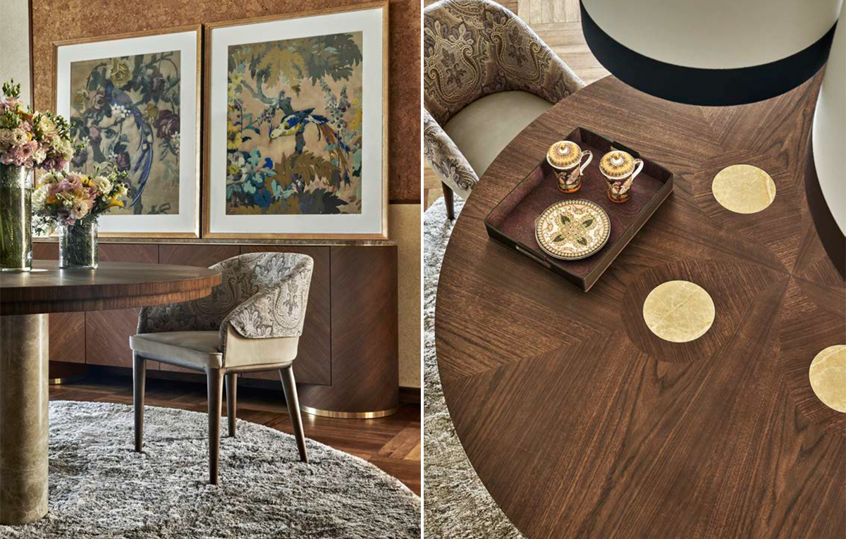 Третья гостиная роскошной виллы собрала в себе три культовых предмета новой коллекции ETRO Home Interiors: кресла Retrò и Quiltana, и секционный диван Retrò. Необычные формы, плавные линии и скругленные объемы красиво играют в контрасте цветов и узоров. Столик Meret сочетает в себе теплоту дерева и глянец металла, в котором отражается окружение.