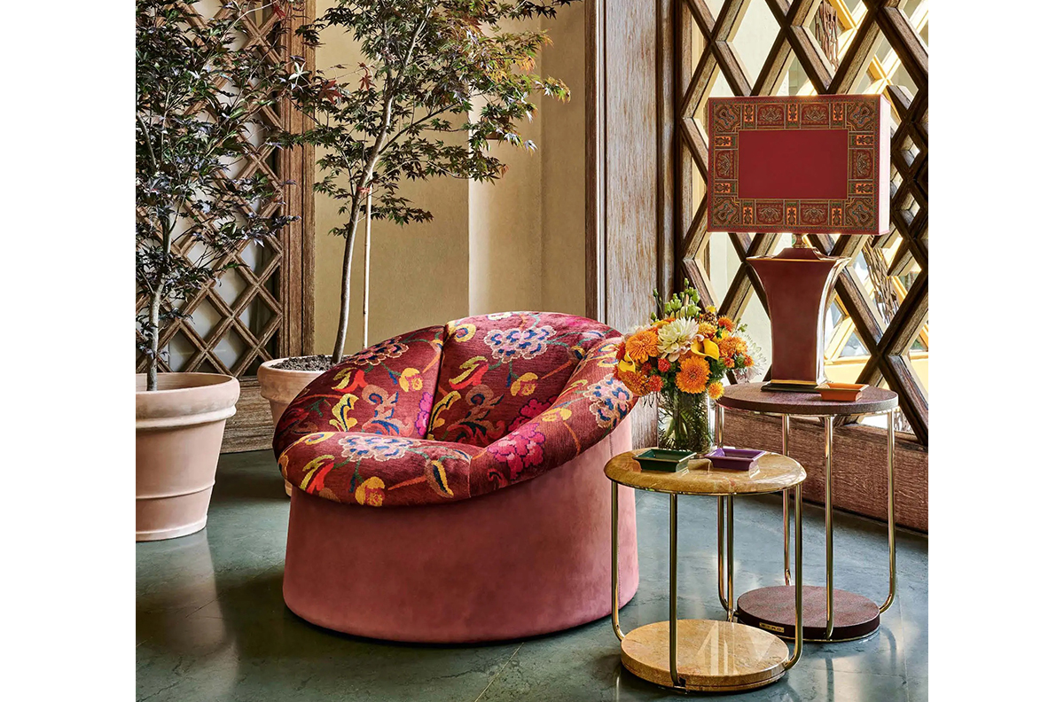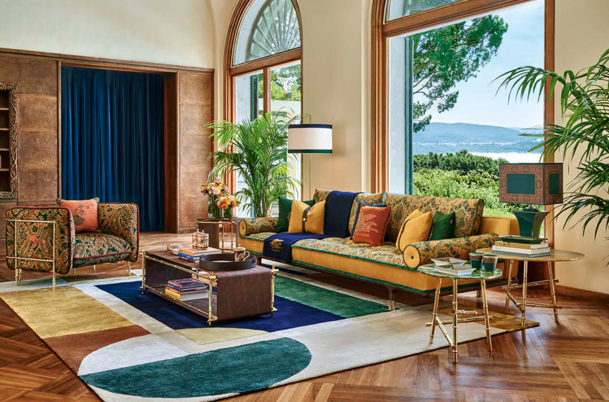 Первая гостиная сразу задает настроение, соответствующее ДНК бренда: яркое, как калейдоскоп узоров и цветов, но настолько гармоничное, что создается ощущение, будто интерьер обволакивает и поглощает.