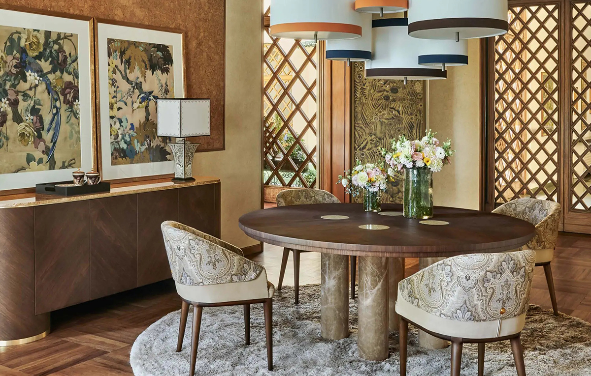 Присутствие бамбуковых мотивов, богатство тканей, скульптурная прочность драгоценных материалов. Каждый элемент рассказывает историю мастерства и видения. Интерьеры побуждают к размышлениям и раскрывают характер. Здесь, где пространство становится эмоцией, дом предстает как живое повествование: текучее, многослойное и постоянно развивающееся.