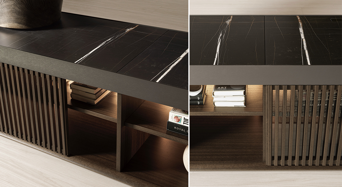 Living Box, спроектированный Винсентом Ван Дуйсеном, претерпел в 2025 году изменения: к фасаду добавились ритмичные вертикальные рейки. Архитектор, дизайнер и креативный директор Molteni&C взял за основу типичный архитектурный проект, уменьшил его масштаб, превратив в предмет интерьера.