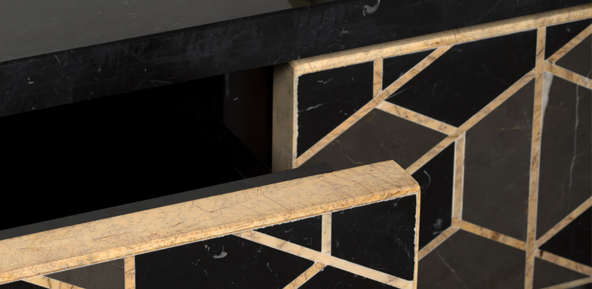 Элегантно и без излишеств смотрится боковой столик Lapiaz Side Table. Он имеет минималистичную геометрическую внешнюю поверхность, которая контрастирует с фактурной и неровной внутренней. Наружное покрытие выполнено из чистого зеркала и латунных листов.