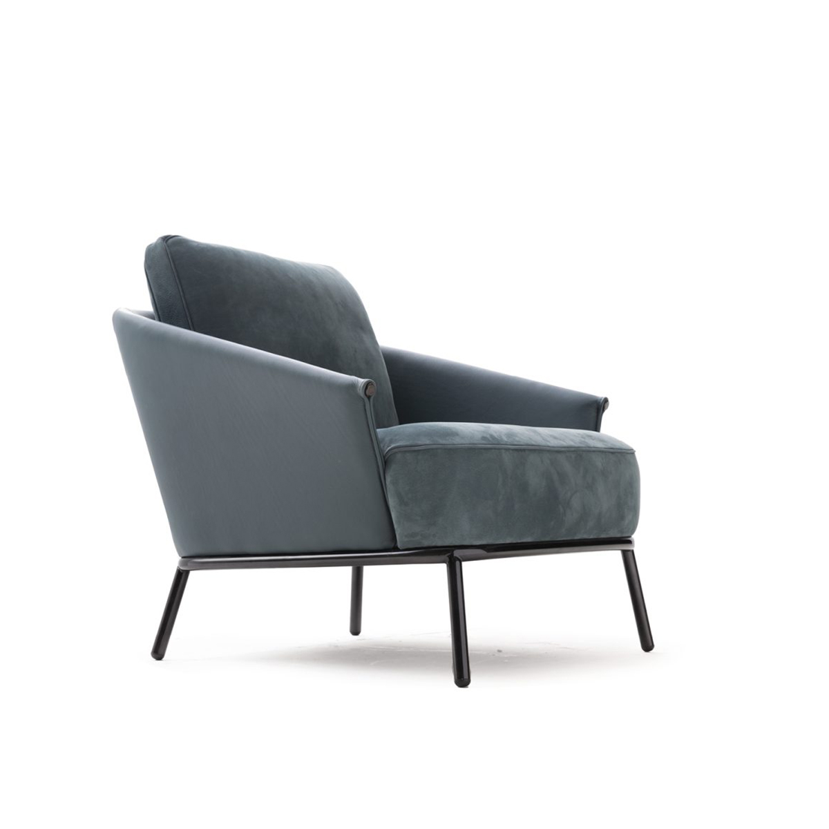 Внешняя часть спинки кресла Sarah полностью оформлена шпоном американского ореха. Она изящно огибает сиденье, выполненное в натуральной коже редкого оливкового цвета. Контраст фактур материалов дает феноменальный тактильный опыт.