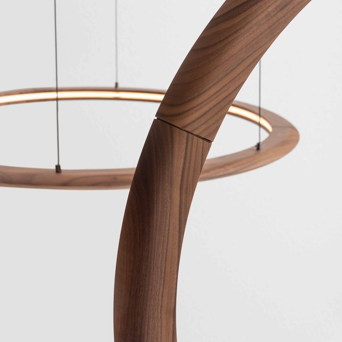 Новинка Ulivi Salotti – светильник Eye, доступный в версиях подвеса или торшера – отличается простой формой и технологической сложностью. Идеально круглый обруч из дерева содержит в себе источник освещения. Получается функциональное, элегантное и теплое освещение.Люстра EYE CHANDELIER, Лампа настольная EYE