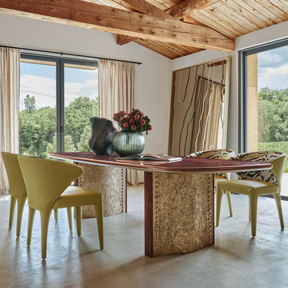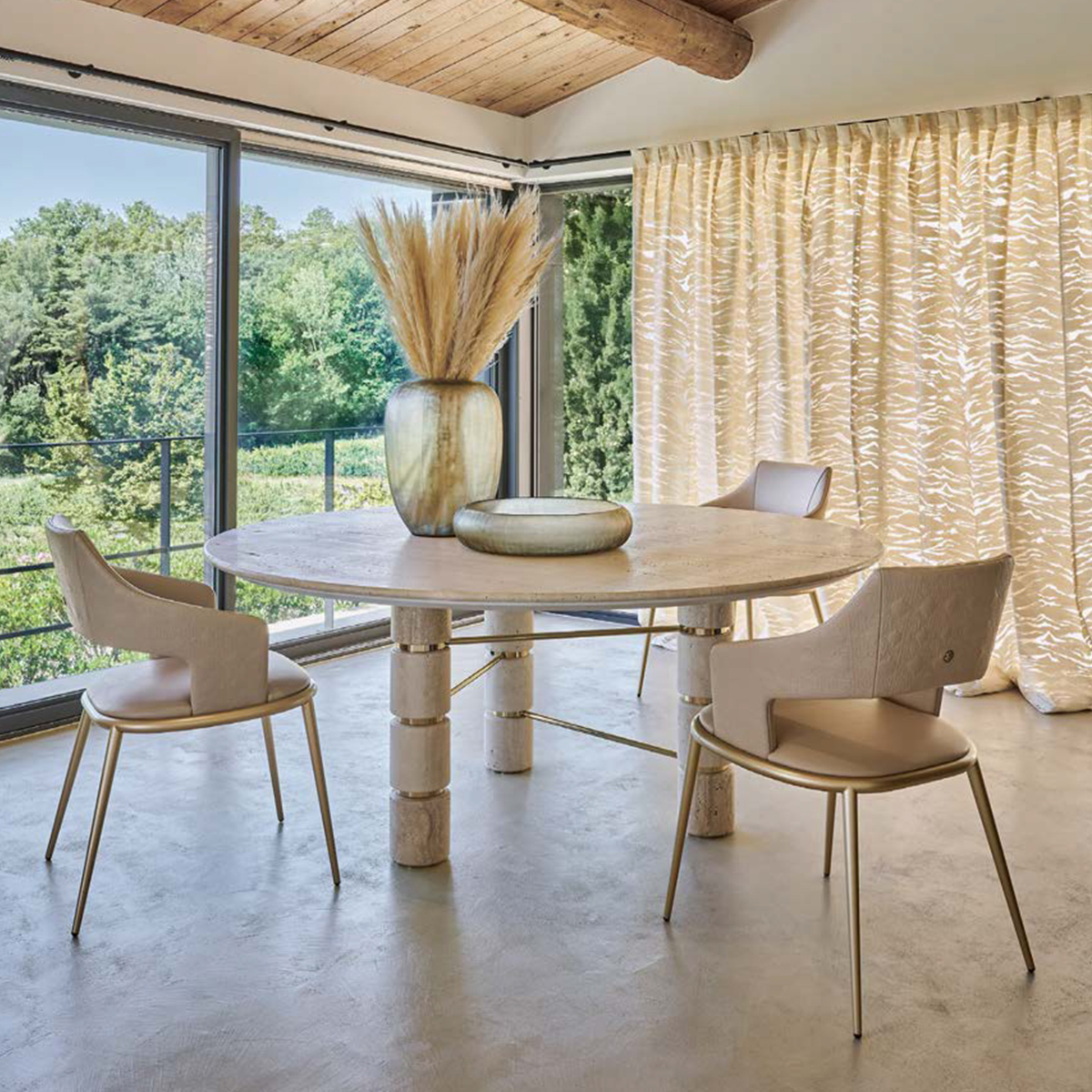 Центральный элемент столовой для официальных приемов и торжеств — обеденный стол Sandstone с мраморной столешницей, украшенной прожилками, которые напоминают изменчивые линии пустынных ландшафтов и придают изделию органическую силу. Под столешницей возвышаются, словно столбы света, скульптурные ножки с золотой отделкой, придавая композиции выразительность.
