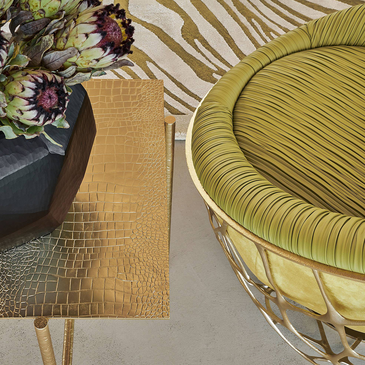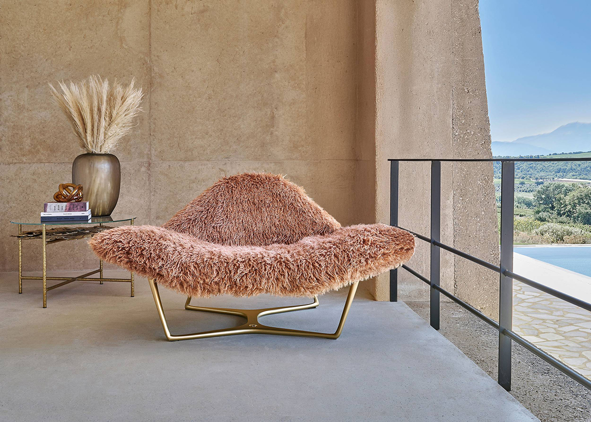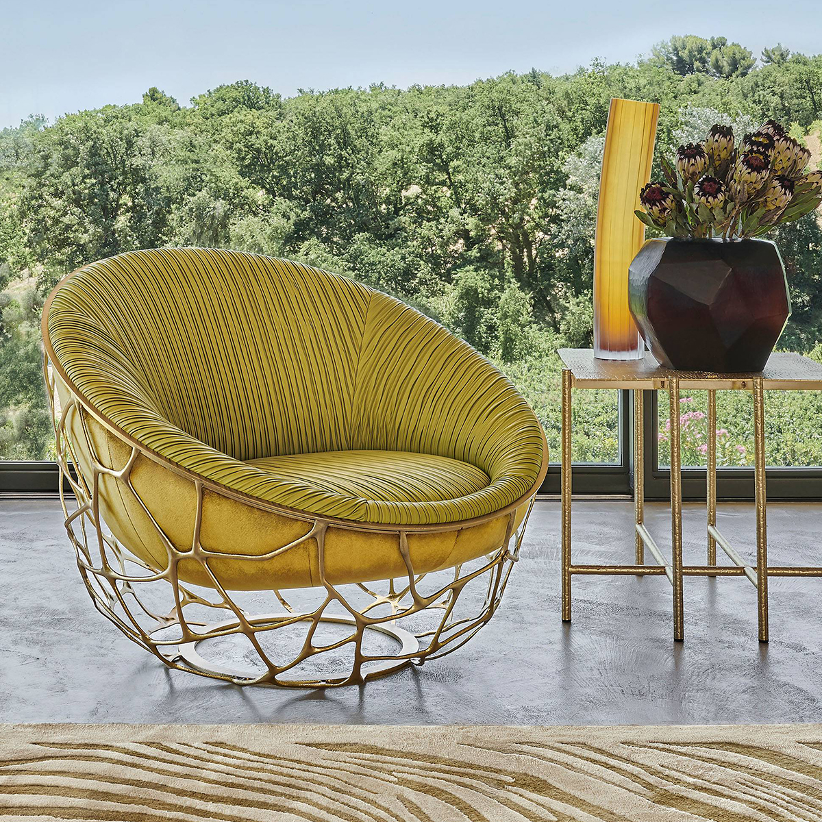 Культовое кресло Sioraf в новой обивке выглядит совершенно иначе: сложный цитроновый оттенок раскрывается в фактурной обивке и красиво дополняет металлическое основание.