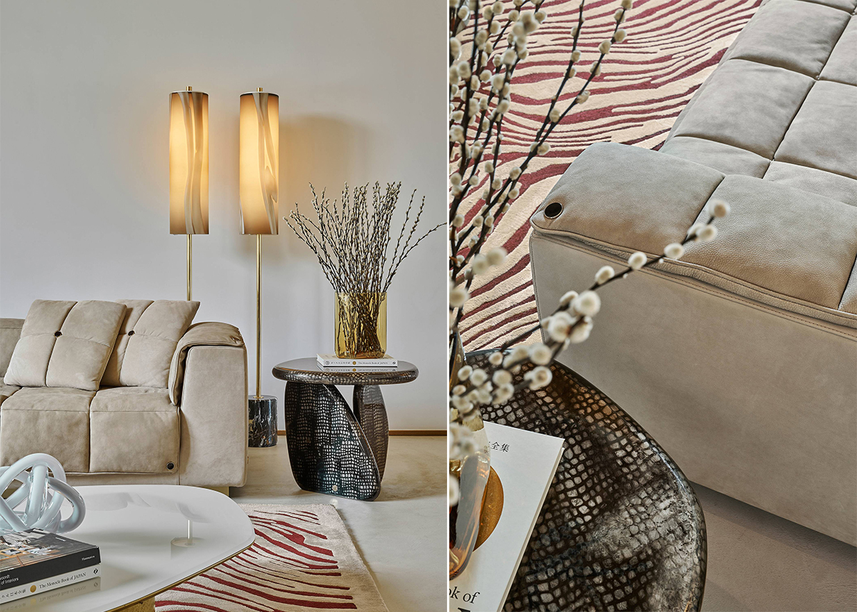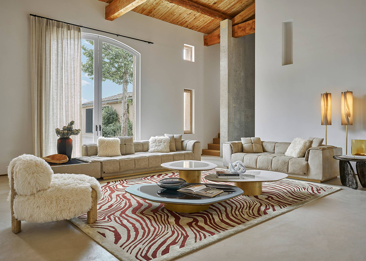 Вторая гостиная более сдержанная по цвету, но не менее чувственная. Она обращается к сенсорике через формы, текстуры и фактуры. Мягкий диван Amargosa, пушистое кресло Toulou, столики с топом органической формы Turkana, гладкий и переливающийся столик Aldabra, — каждый предмет говорит на языке чувств.Диван AMARGOSA, Модульный диван AMARGOSA, Кресло TOULOU, Журнальный столик ALDABRA