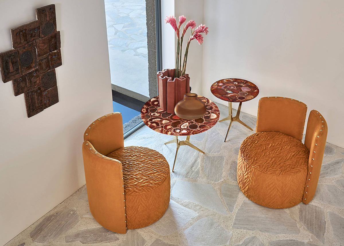 Центральный элемент столовой для официальных приемов и торжеств — обеденный стол Sandstone с мраморной столешницей, украшенной прожилками, которые напоминают изменчивые линии пустынных ландшафтов и придают изделию органическую силу. Под столешницей возвышаются, словно столбы света, скульптурные ножки с золотой отделкой, придавая композиции выразительность.