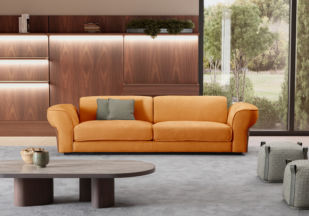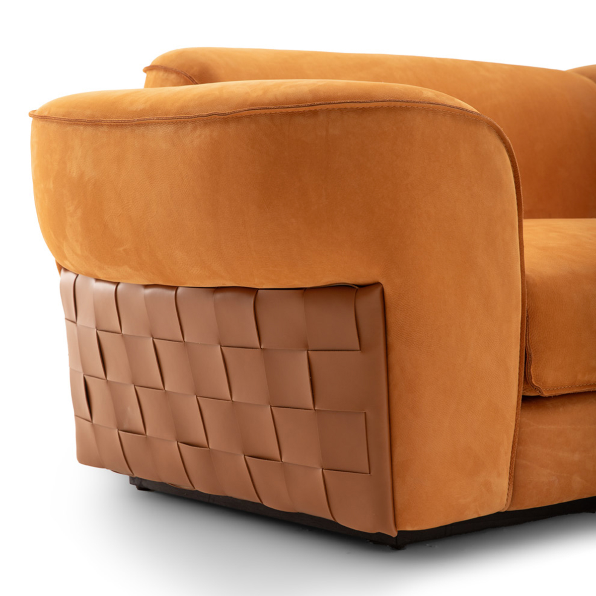 Новинка Ulivi Salotti — диван Plaf — впечатляет своими объемными подлокотниками, которые делают предмет еще округлее и гостеприимнее. Теплый тыквенный оттенок, мягкая натуральная кожа и привлекательная форма благоприятствуют наслаждению моментом отдыха. Сложное плетение, украшающее боковины дивана, добавляют визуального интереса и ритма.