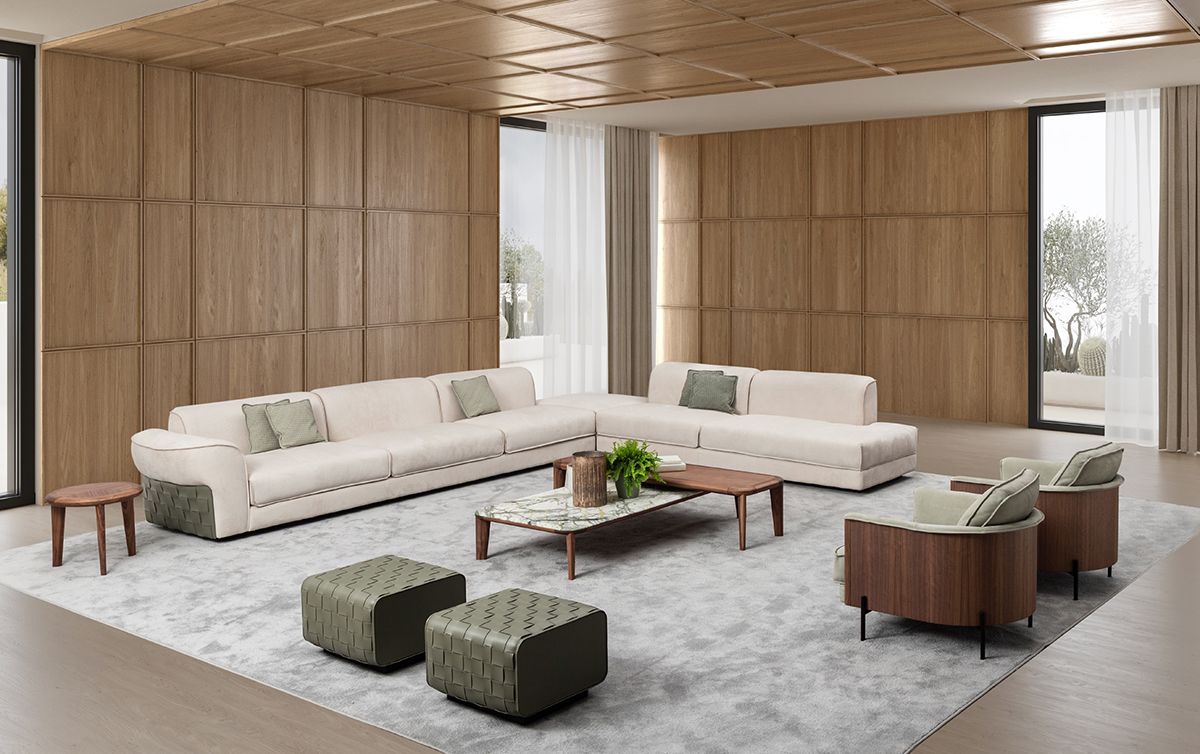 Та же конфигурация — L-образный диван и два кресла, поставленные рядом, работает совсем иначе с объемным и модульным Plaf и сдержанными по форме Dahlia с внешней частью, облицованной шпоном.