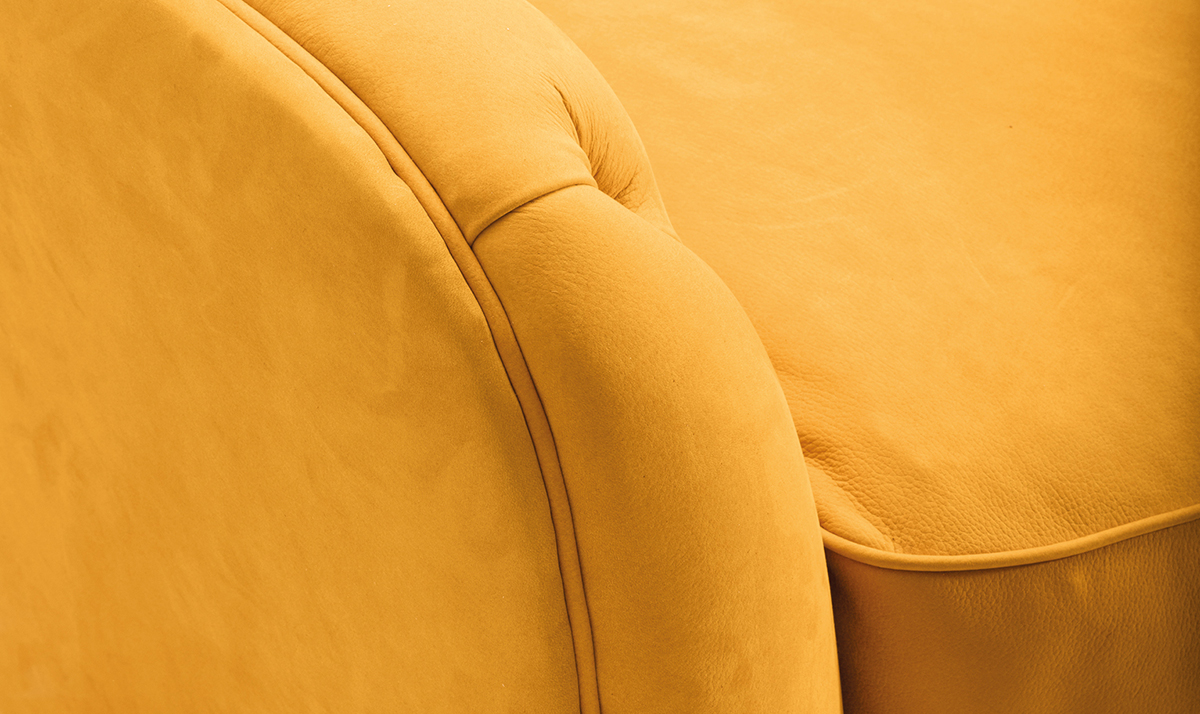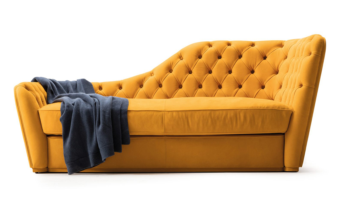 Диван Angie в пряном оттенке шафрана смотрится невероятно уютно. Асимметричная спинка в отделке капитоне добавляет предмету шарма и играет с функцией: Angie словно балансирует между кушеткой и диваном.