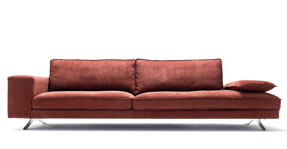 Диван Victor по проекту Castello Lagravinese Studio, представленный в трендовом медном оттенке, смотрится уютно. Широкие и глубокие подушки сиденья покоятся на Х-образных металлических ножках, определяющих дизайн предмета. Объемные строчки, оформляющие множественные подушки спинки, придают графичности и многогранности.