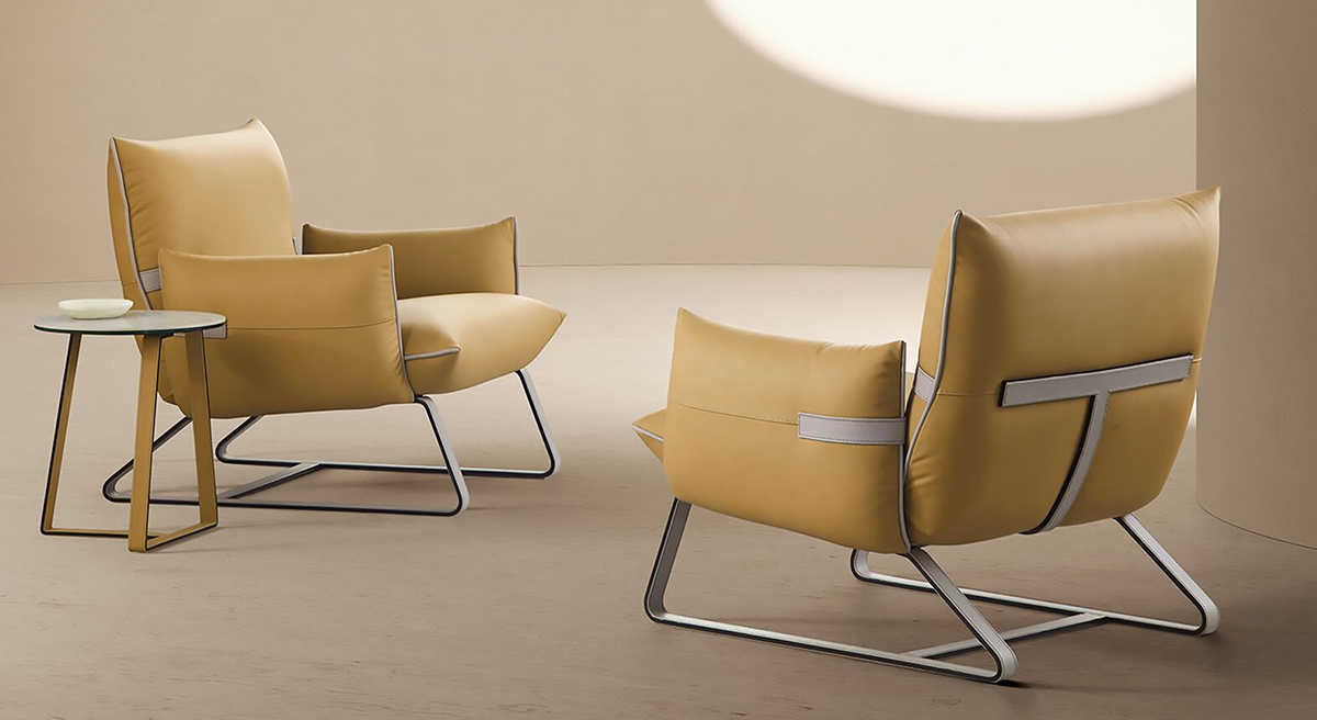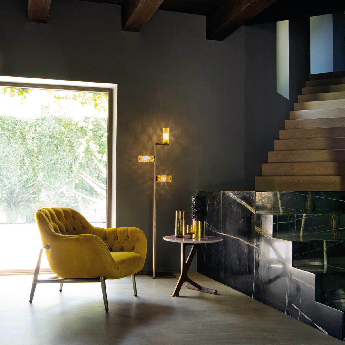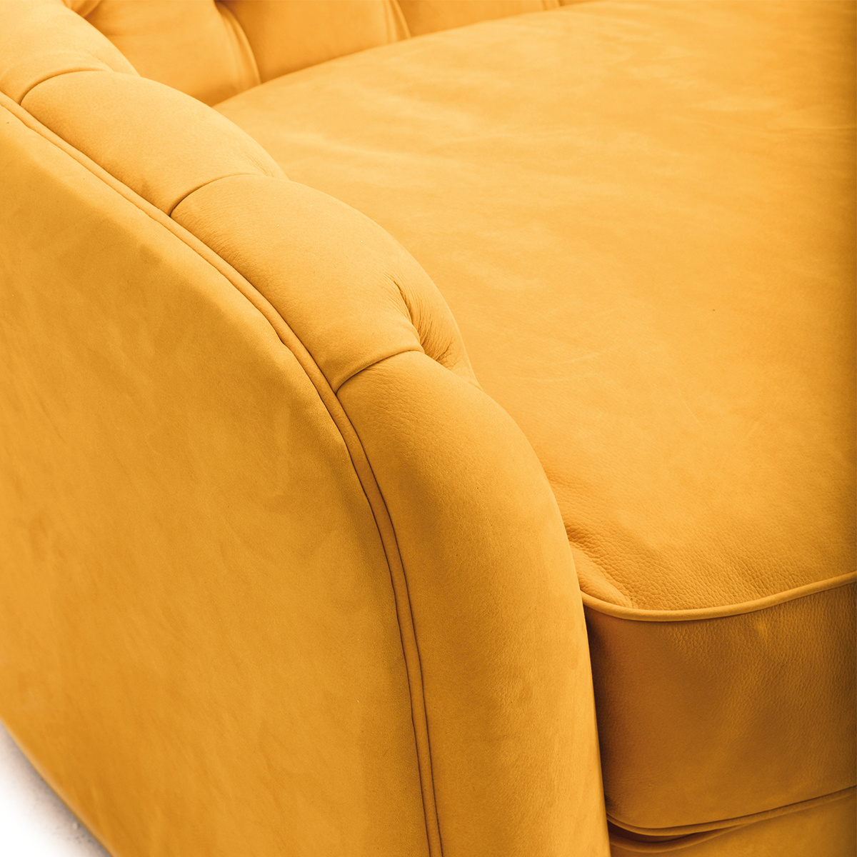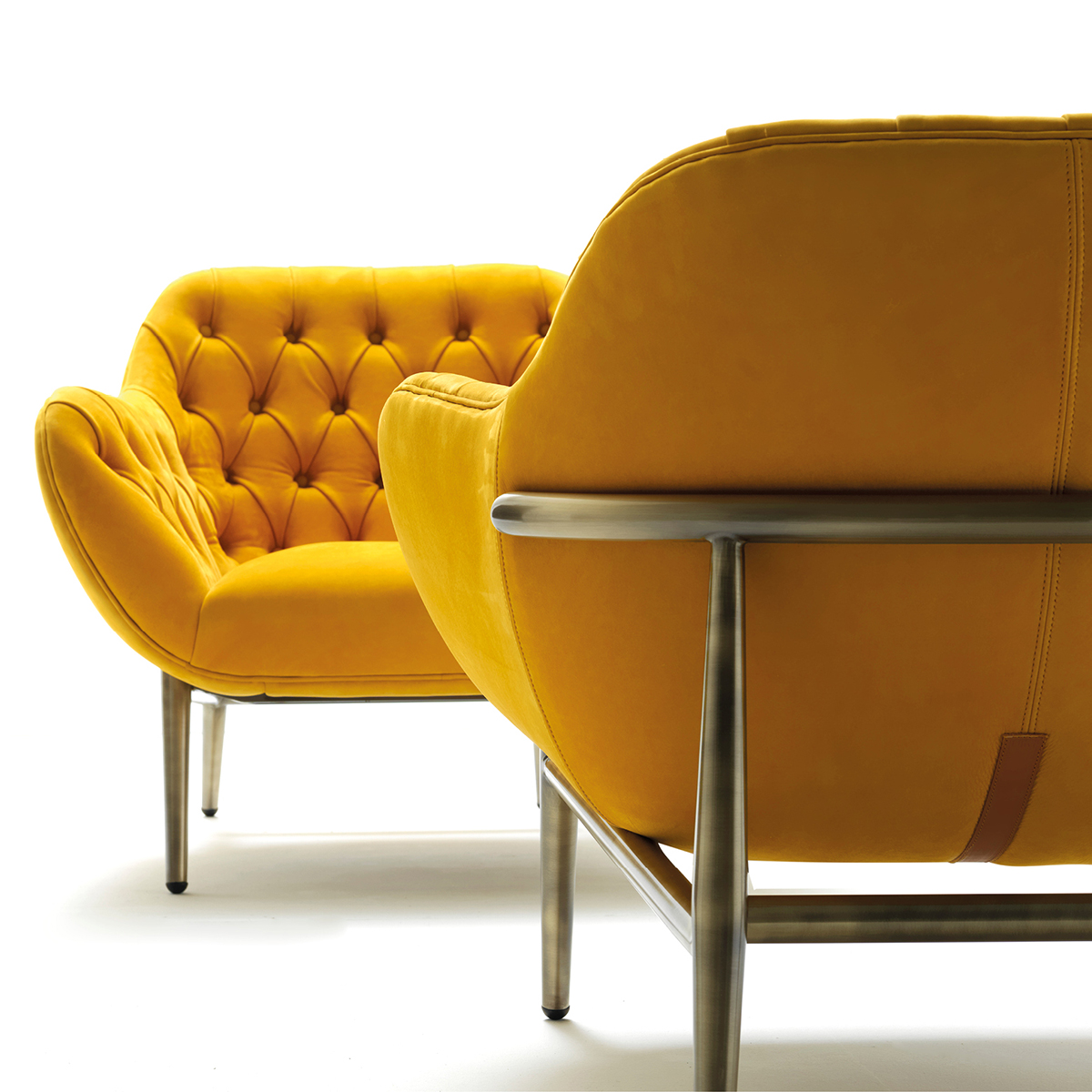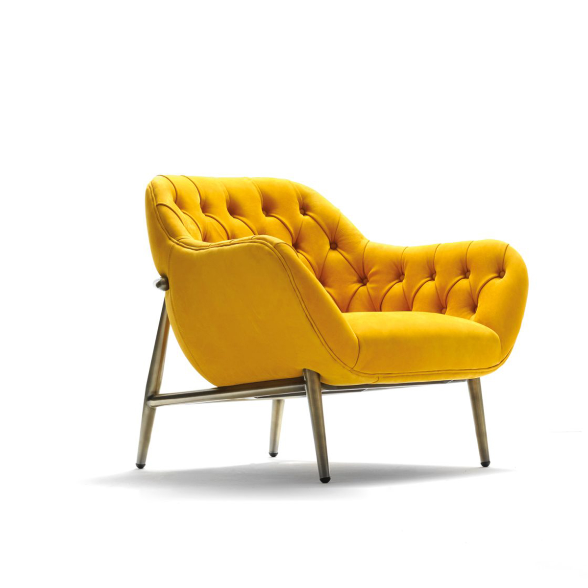 Кресло Jade по проекту Castello Lagravinese Studio – синоним уюта: обволакивающая мягкая форма сиденья, подчеркнутая строчкой капитоне, и пряный шафрановый оттенок.