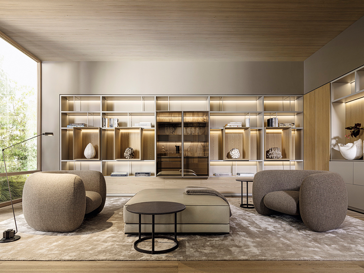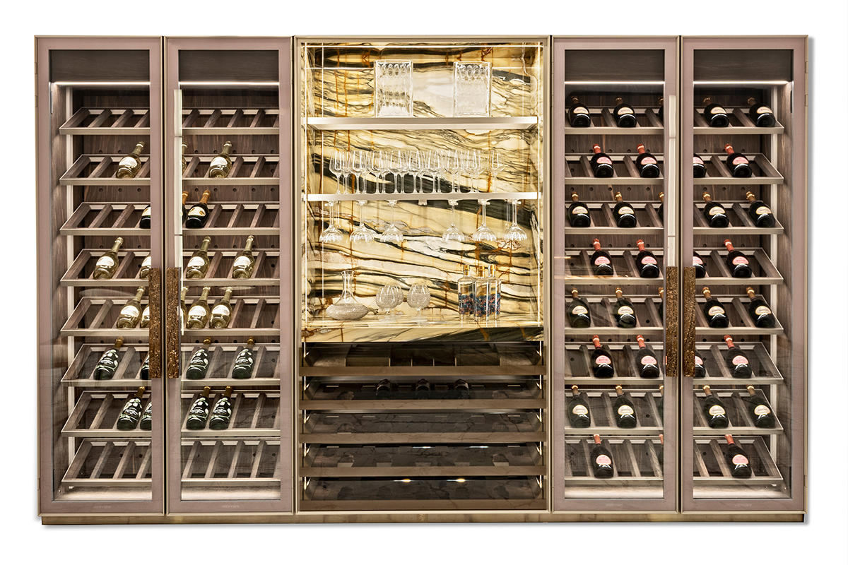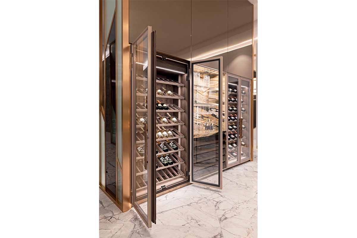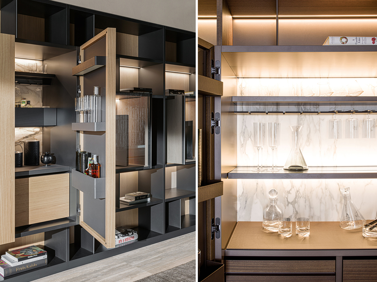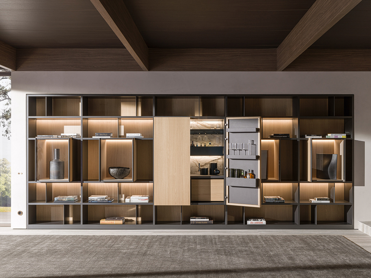 Если коллекция вин небольшая, можно сформировать дегустационную зону в гостиной с элегантной системой хранения 505 Up System от Николы Галлиция для Molteni&C.