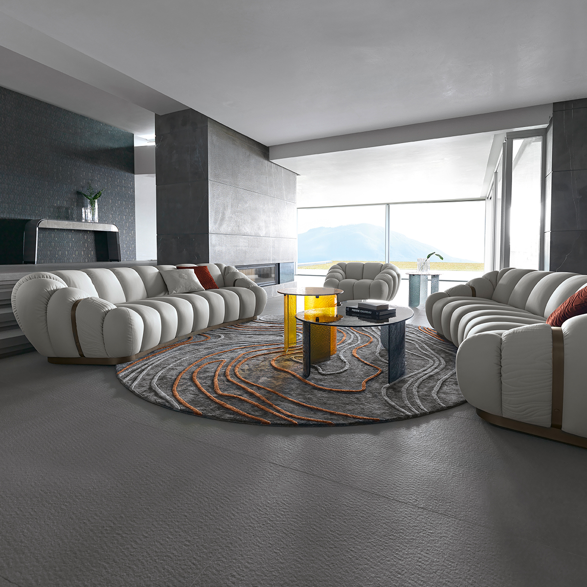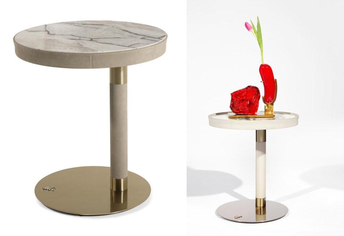 Приставной столик Drums отличается современным и гибким дизайном. Круглые столешницы могут быть выполнены в разных отделках: дымчатое стекло, керамика и мрамор. Периметр обтянут кожей и украшен элегантными шнурками, напоминая о мире моды.