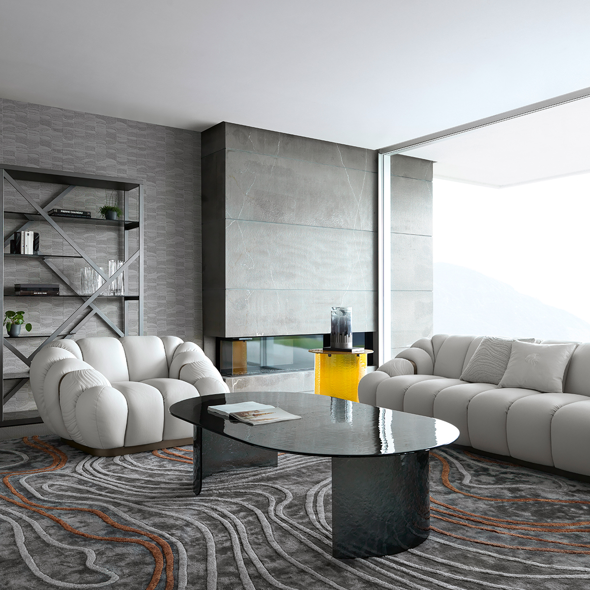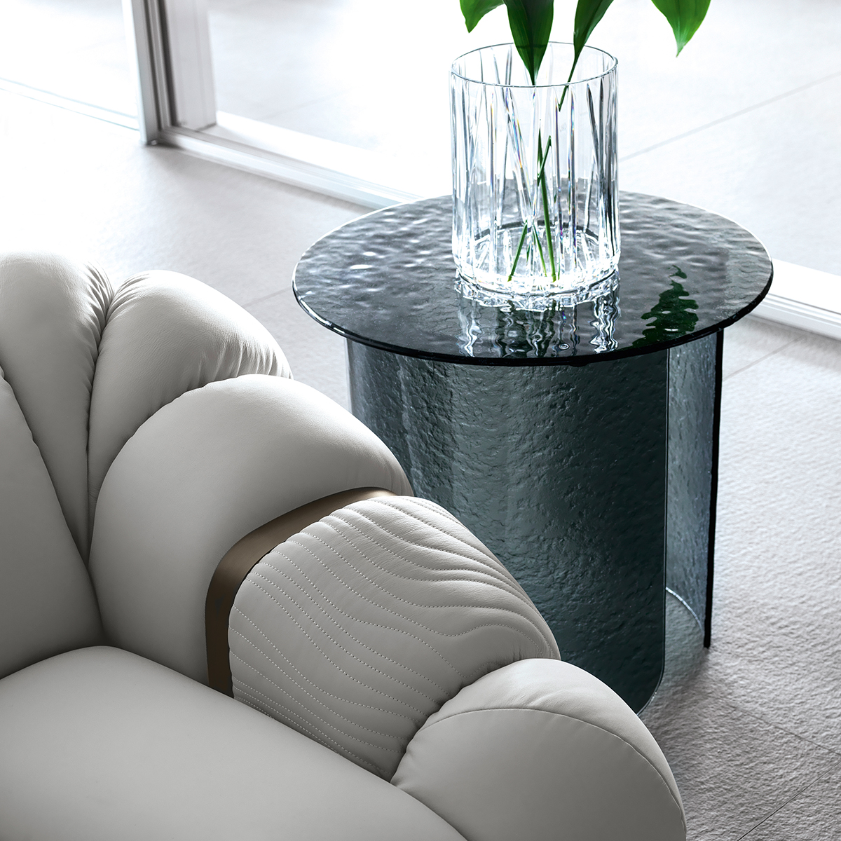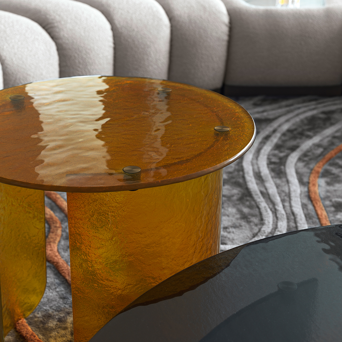Столик Tresor выполнен из суперпрочного цветного стекла с активной текстурой. Он выглядит мягко за счет плавных линий и ярко благодаря тому, что стекло пропускает свет, умножая его в пространстве.