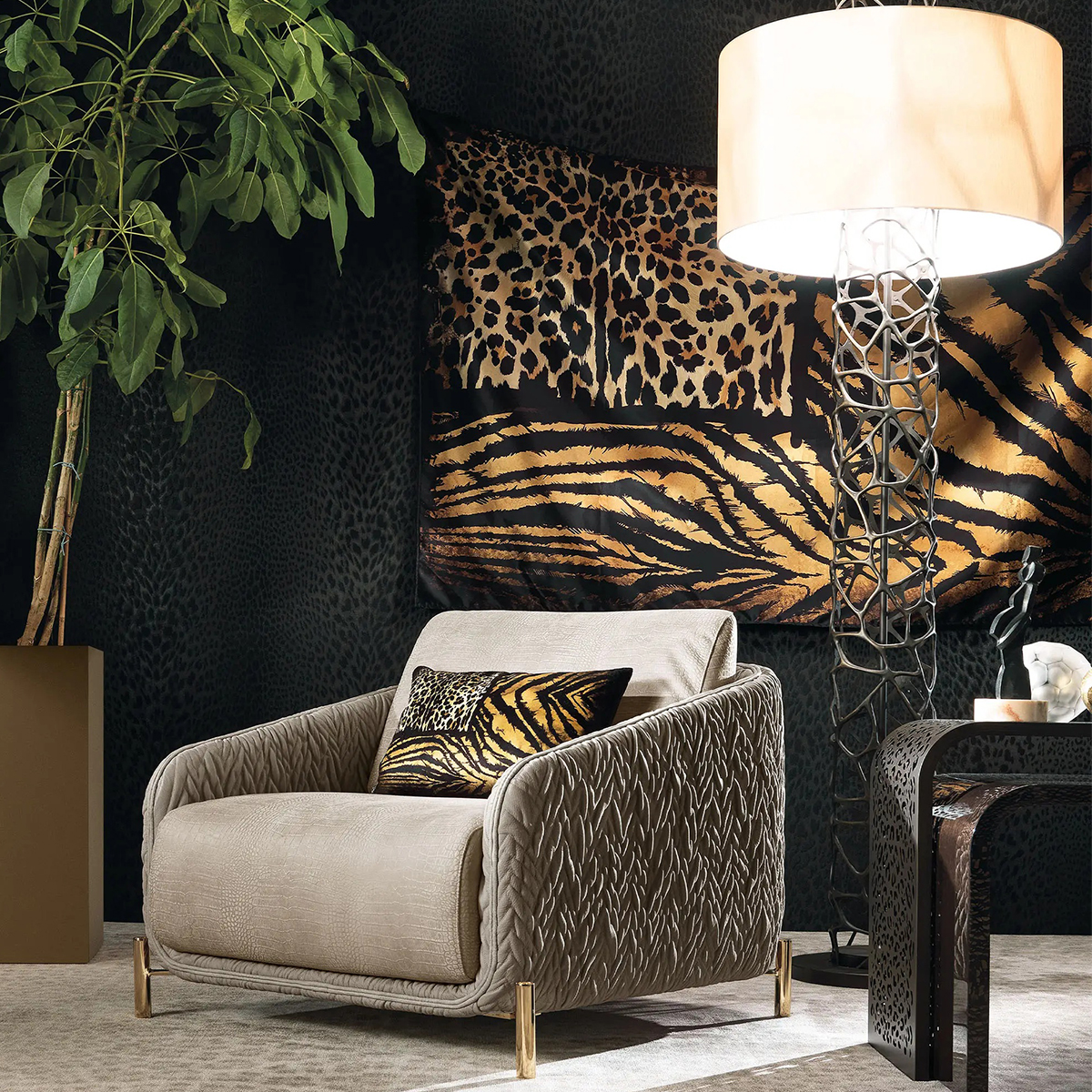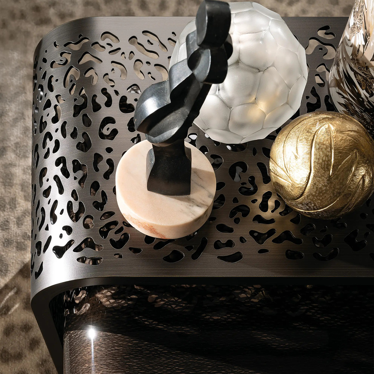 Столик Watamu, фактически состоящий из двух, покоряет своим пышным и изысканным декором: верхняя столешница выполнена из металла с рисунком лазерной резкой, взывающим в памяти анималистические мотивы. Нижняя столешница сделана из дерева.