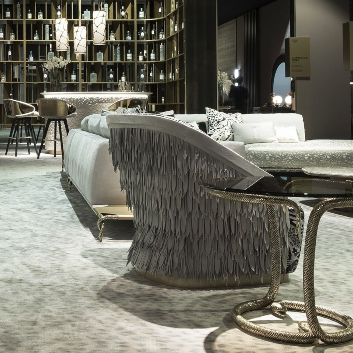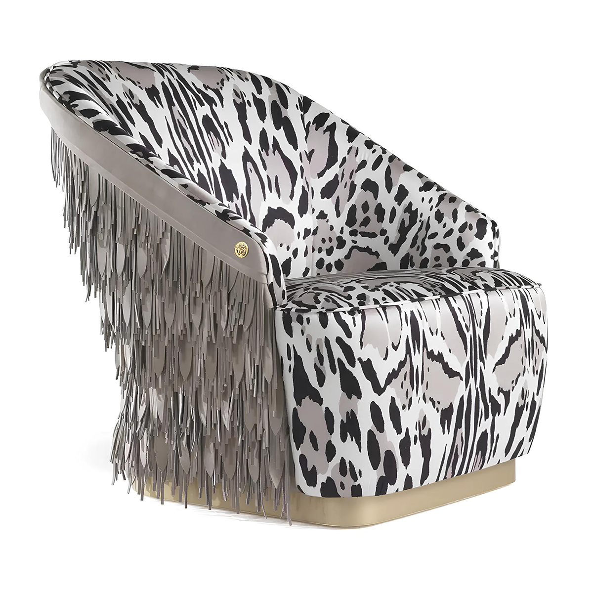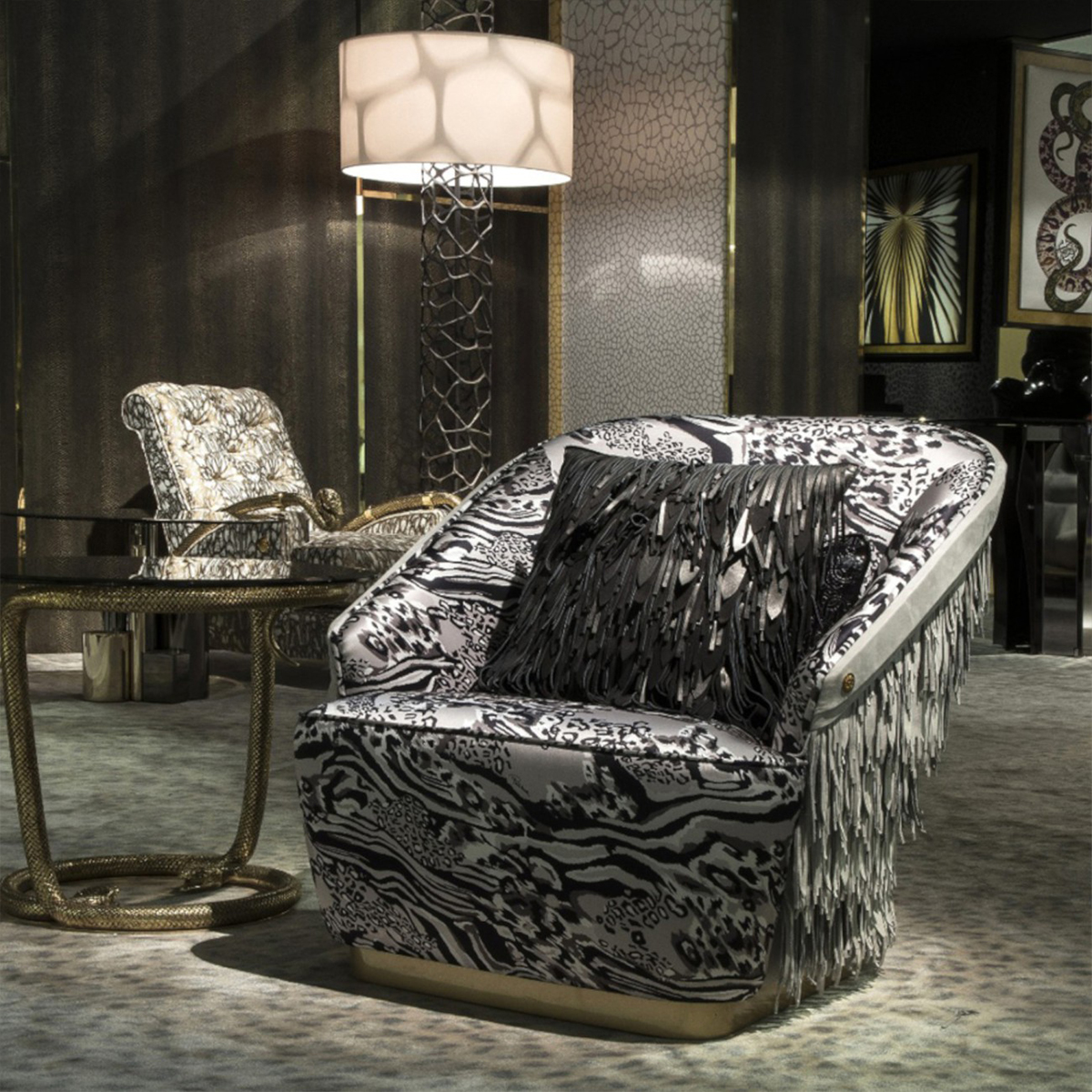 Roberto Cavalli Home Interiors всегда остается верным своему характерному стилю, при этом опережая тренды. Так, компактное кресло Dudley, впервые представленное миру в 2019 году, характеризуется необычной и эффектной спинкой, украшенной кожаной бахромой. Оно никогда не теряло своей актуальности, но сейчас буквально обрело второе дыхание.