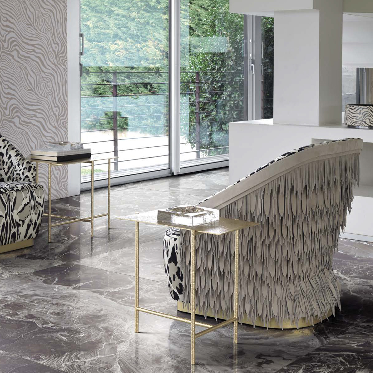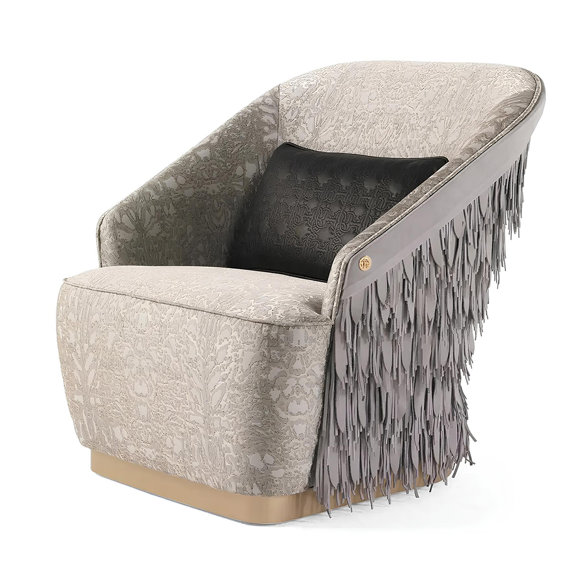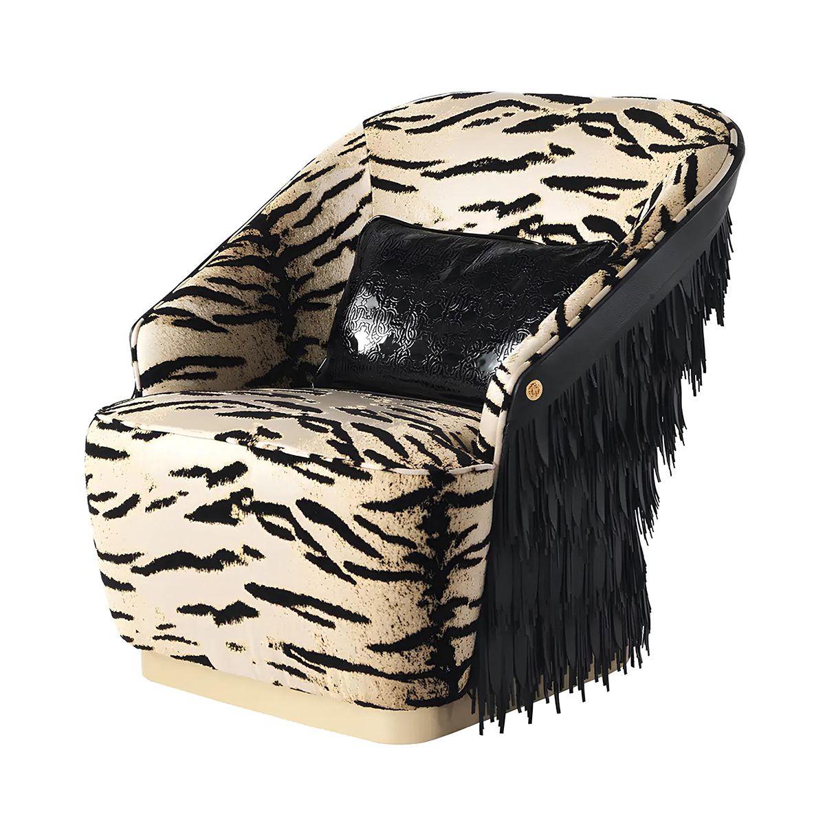 Roberto Cavalli Home Interiors всегда остается верным своему характерному стилю, при этом опережая тренды. Так, компактное кресло Dudley, впервые представленное миру в 2019 году, характеризуется необычной и эффектной спинкой, украшенной кожаной бахромой. Оно никогда не теряло своей актуальности, но сейчас буквально обрело второе дыхание.