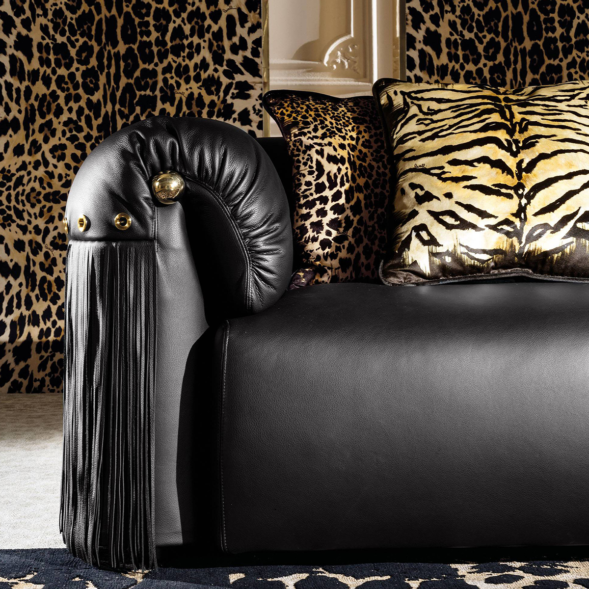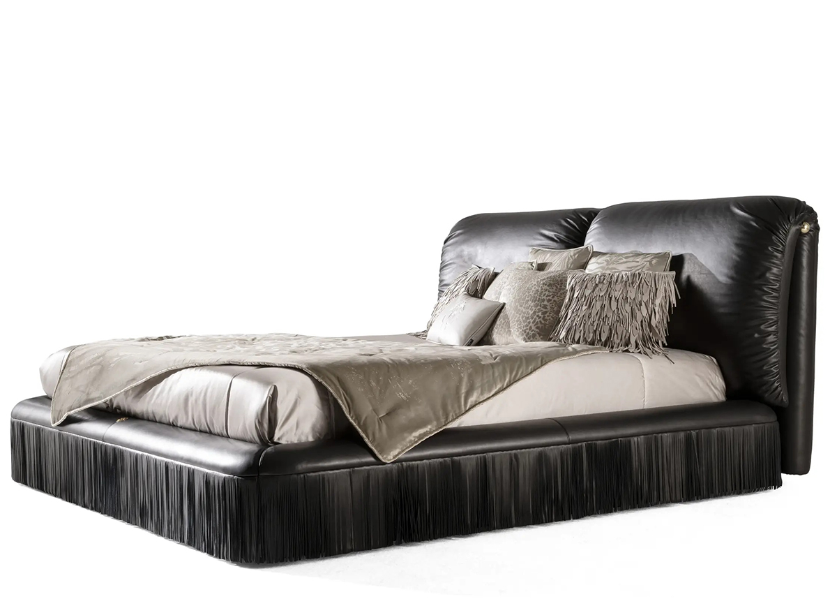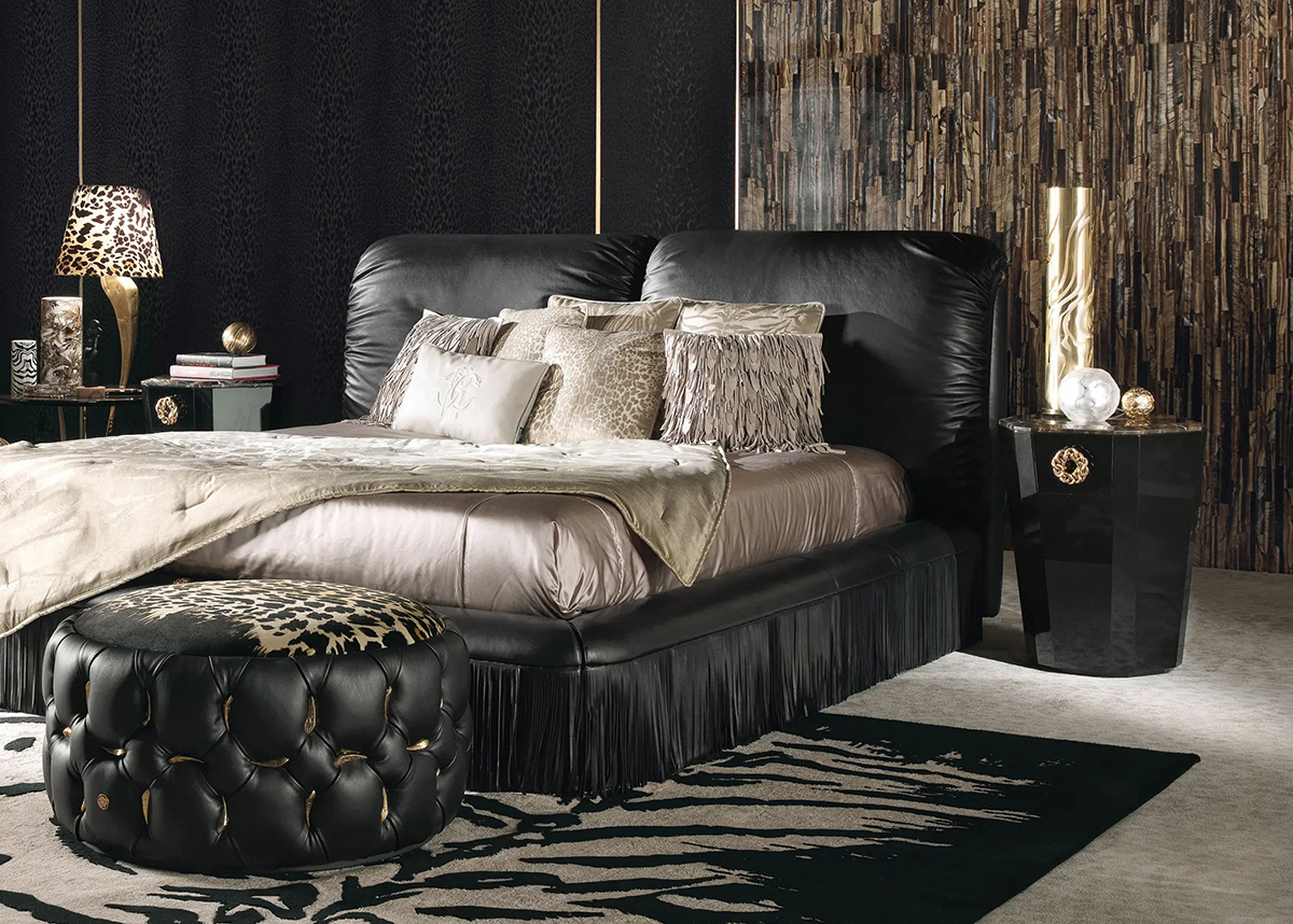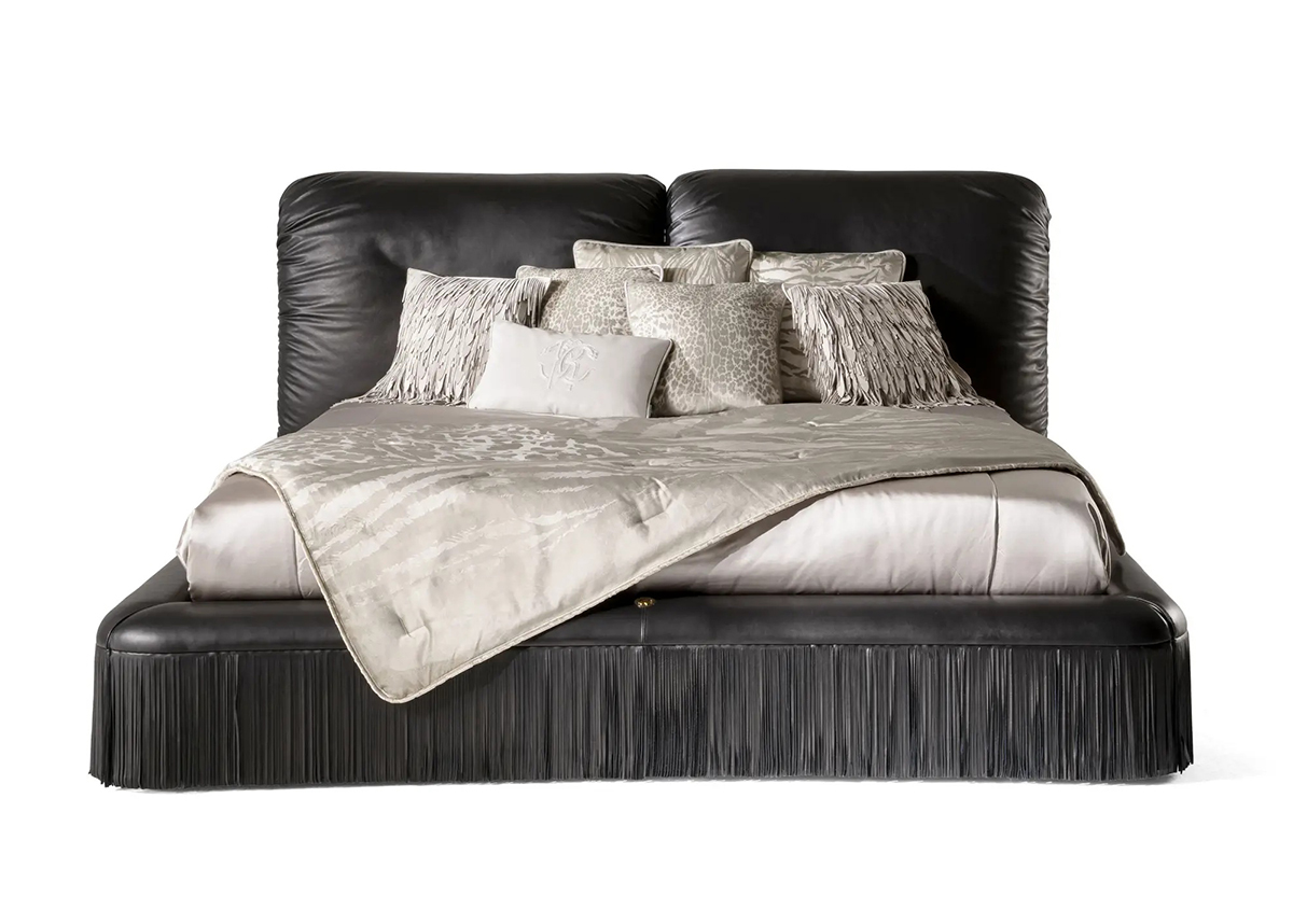 Почему бы не внести нотку игривости в спальню с кроватью Malawi? Периметр основания полностью украшен кожаной бахромой, которая задает ритм и визуальную легкость, уравновешивая две массивные подушки изголовья.БАНКЕТКА MALAWI, ROBERTO CAVALLI HOME INTERIORS