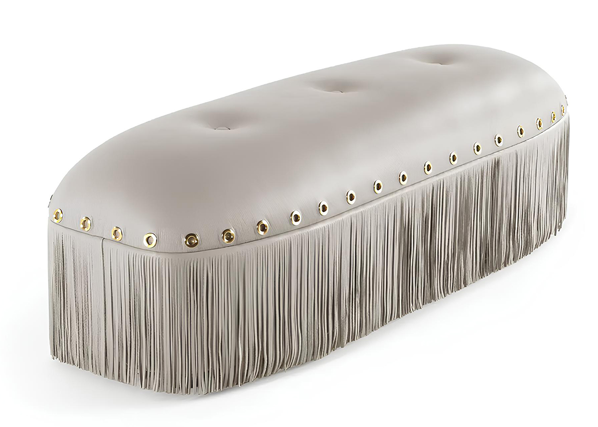 Если же кровать с бахромой кажется вам слишком смелым решением, можно выбрать банкетку из одноименной серии в пару к кровати Nilo с эффектным плетением по центру изголовья.