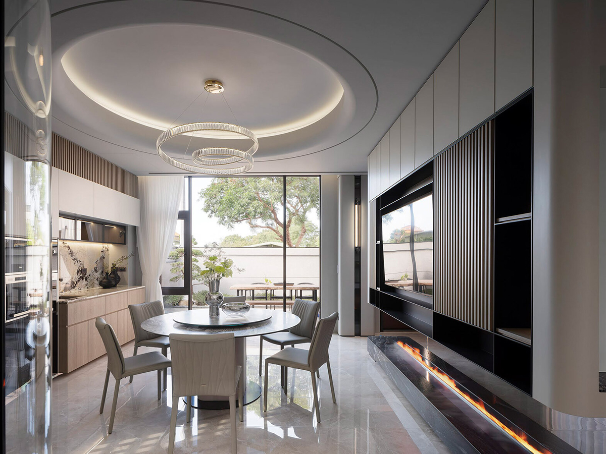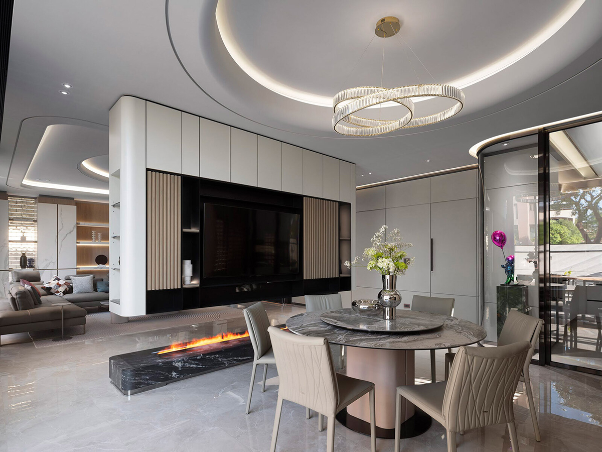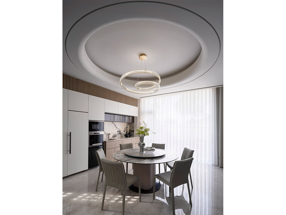 В центре столовой — обеденный стол Milos с безупречным формальным балансом. Скругленное ортогональное основание, обитое натуральной кожей, эффектно контрастирует с круглой мраморной столешницей с Lazy Susan. Двойной круглый топ вторит закрученному спиралевидному светильнику и круглому потолку.СПАЛЬНЯ