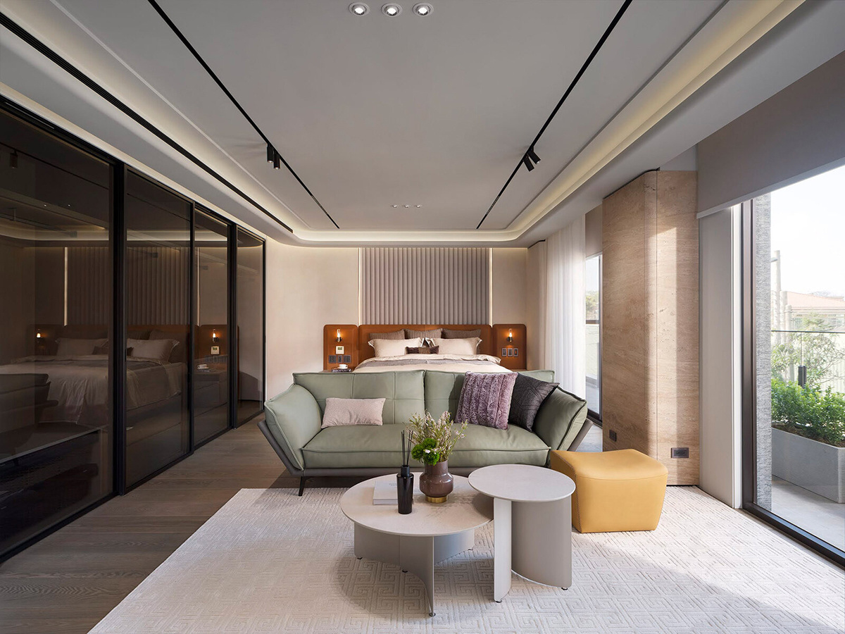 В гостиной центральное место занимает модульный диван Sunset, истинное воплощение комфорта: объемный, вместительный, с регулируемой спинкой для удобного отдыха. Завершают композицию журнальные столики Block, скульптурные и практичные.