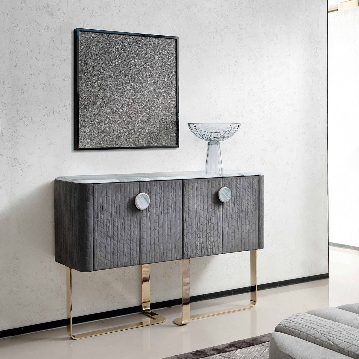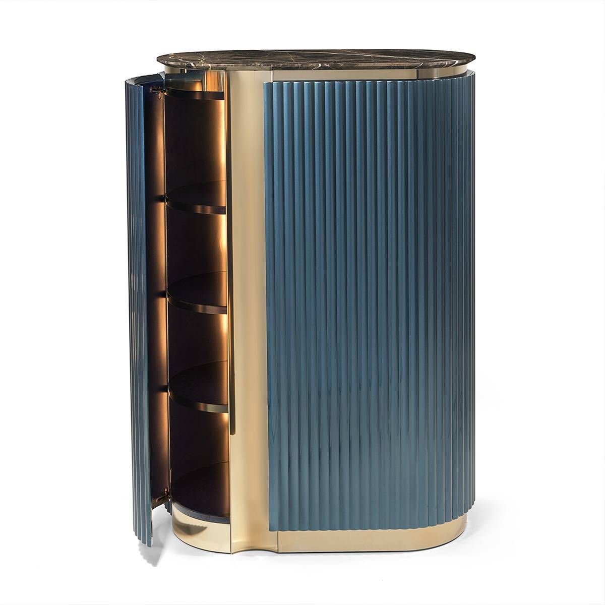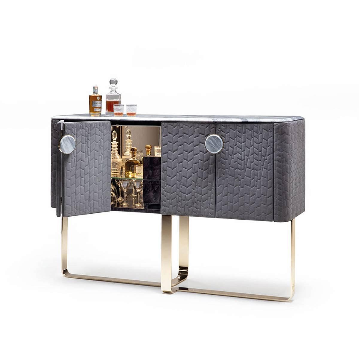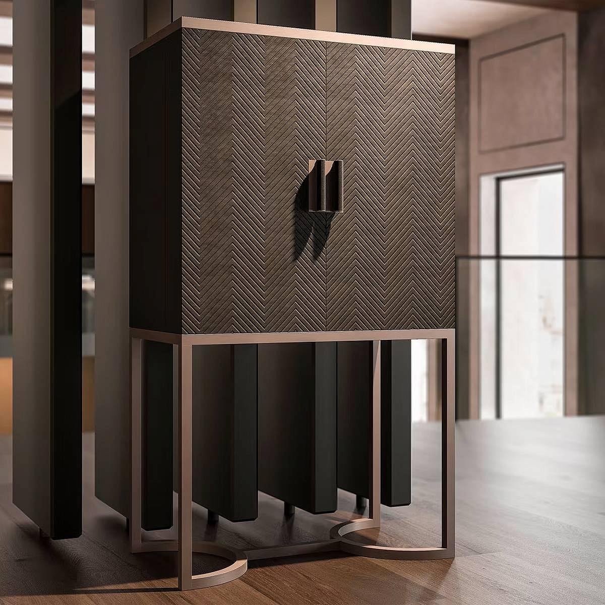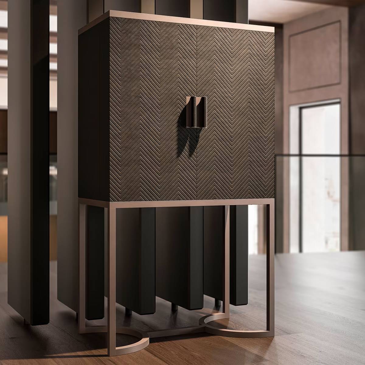 Более монументально выглядят монолитные барные шкафы, фасады которых могут быть обиты кожей, текстурированы или украшены крупными декоративными элементами.