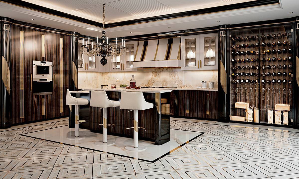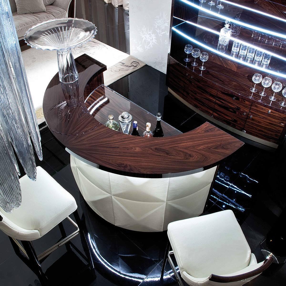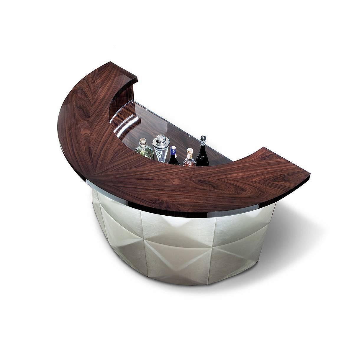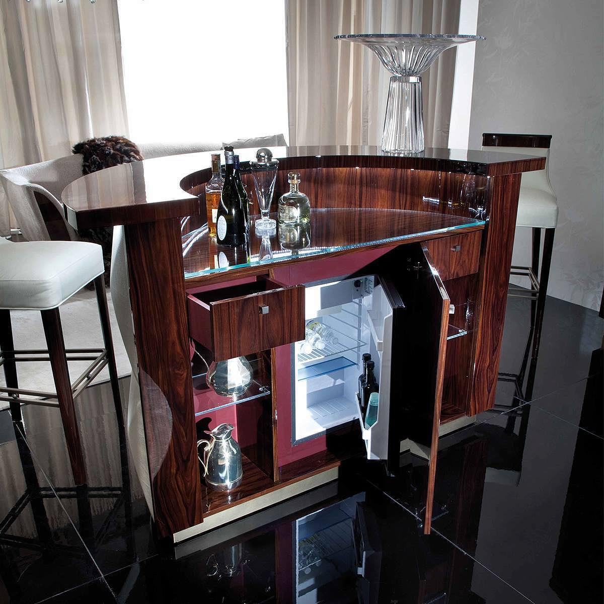 Если же вам хочется большей приватности, то лучше отделить барную зону от кухни и выбрать эффектную барную стойку. Это решение целесообразно еще и потому, что в барных стойках есть встроенные холодильные камеры для напитков и ящички с бархатным дном для хранения бокалов, как, например, в полукруглой барной стойке Coliseum (Giorgio Collection) из шпона бразильского палисандра.