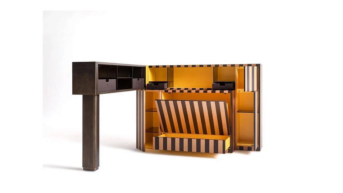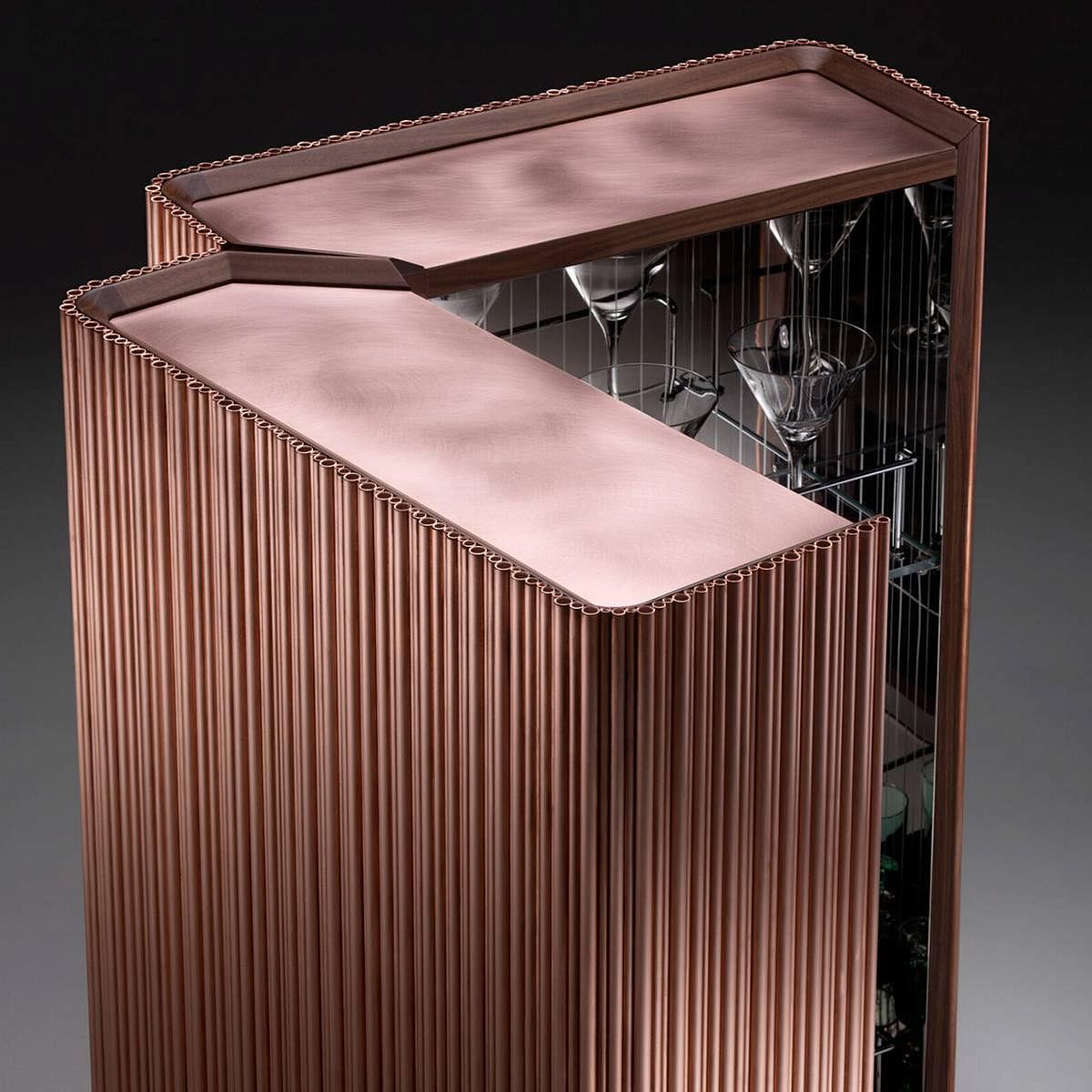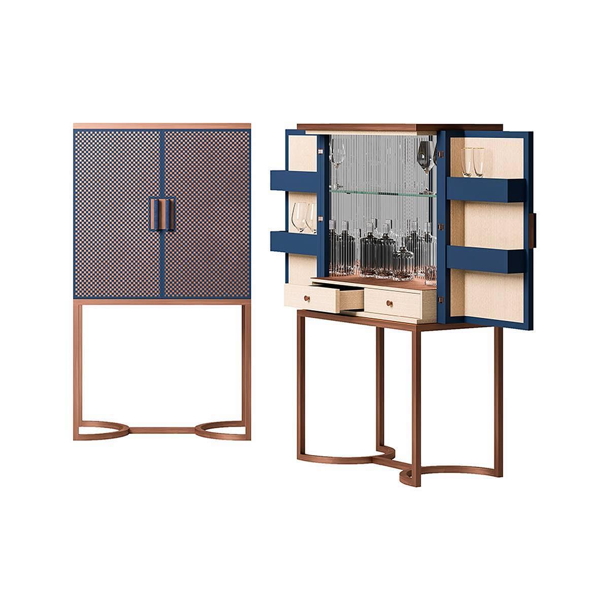 Мобильный бар задуман как уникальный предмет мебели с отсеками для хранения бокалов, держателями для бутылок и полками.