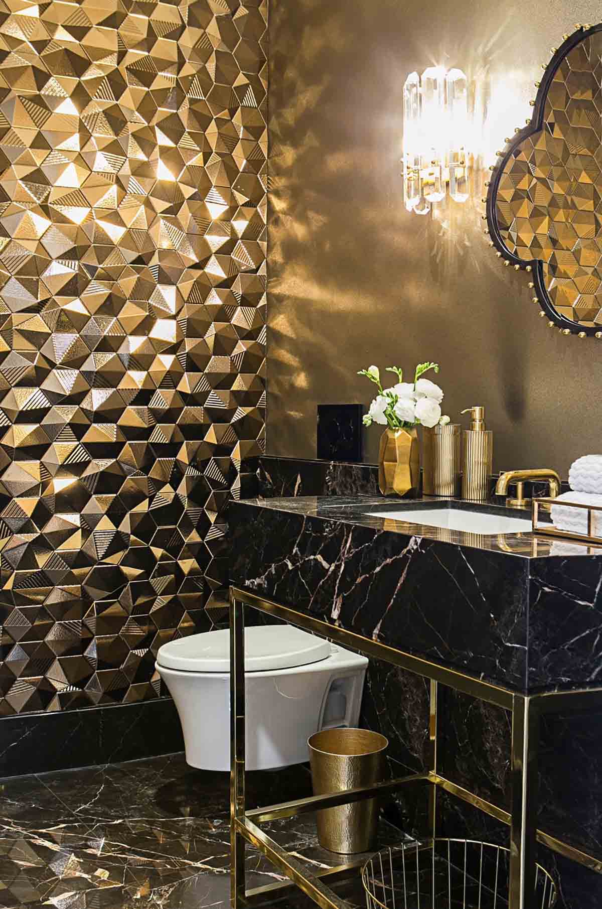 В дамской комнате отличительными чертами становятся золотая плитка с шестигранными модулями в сочетании с текстурированными золотыми обоями и изготовленной на заказ раковиной из мрамора.